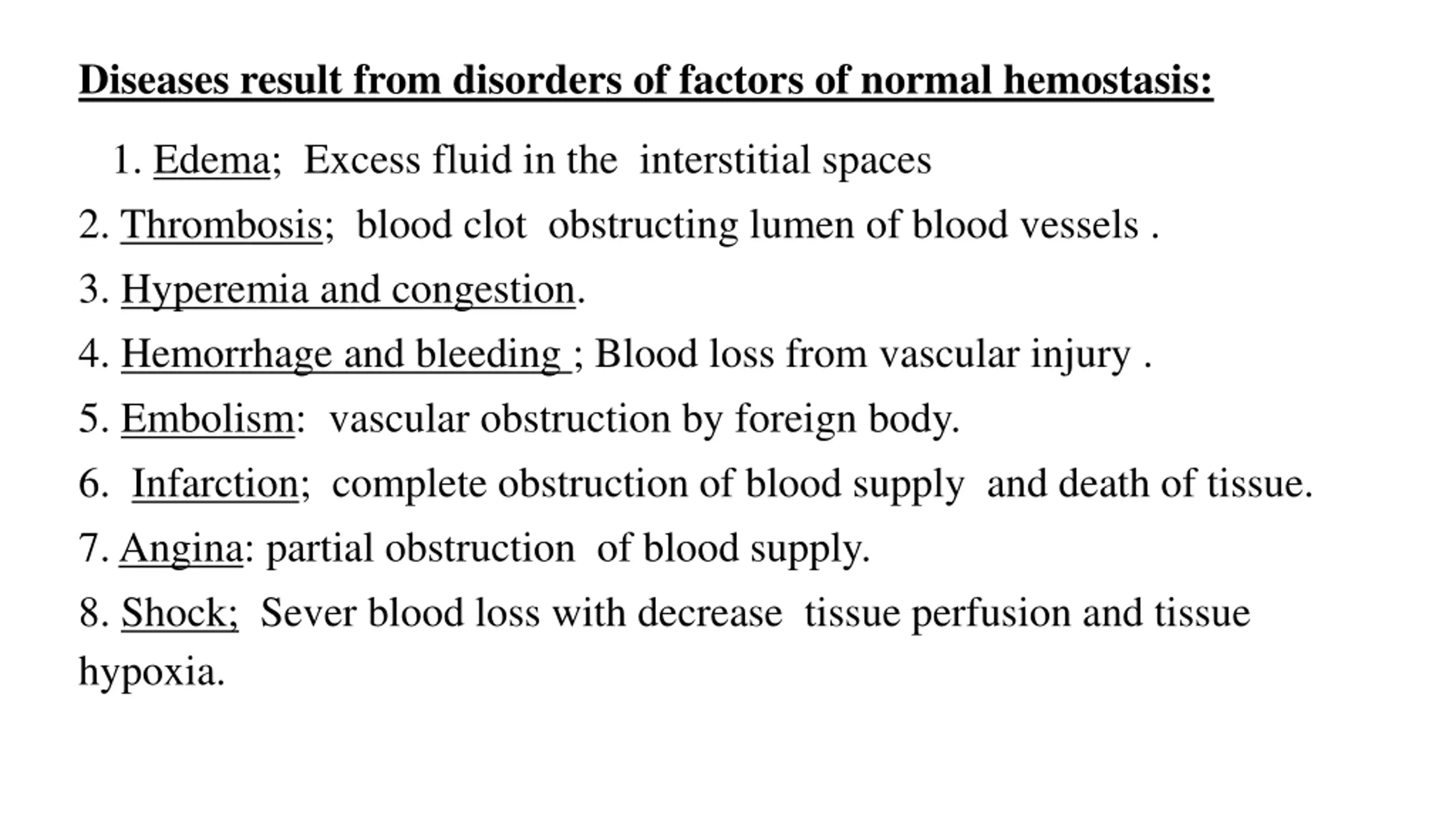 Diseases result from disorders of factors of normal hemostasis: 1. Edema; Excess fluid in the interstitial spaces 2. Thrombosis; blood clot obstructing lumen of blood vessels . 3. Hyperemia and congestion. 4. Hemorrhage and bleeding ; Blood loss from vascular injury . 5. Embolism: vascular obstruction by foreign body. 6. Infarction; complete obstruction of blood supply and death of tissue. 7. Angina: partial obstruction of blood supply. 8. Shock; Sever bloodloss with decrease tissue perfusion and tissue hypoxia.