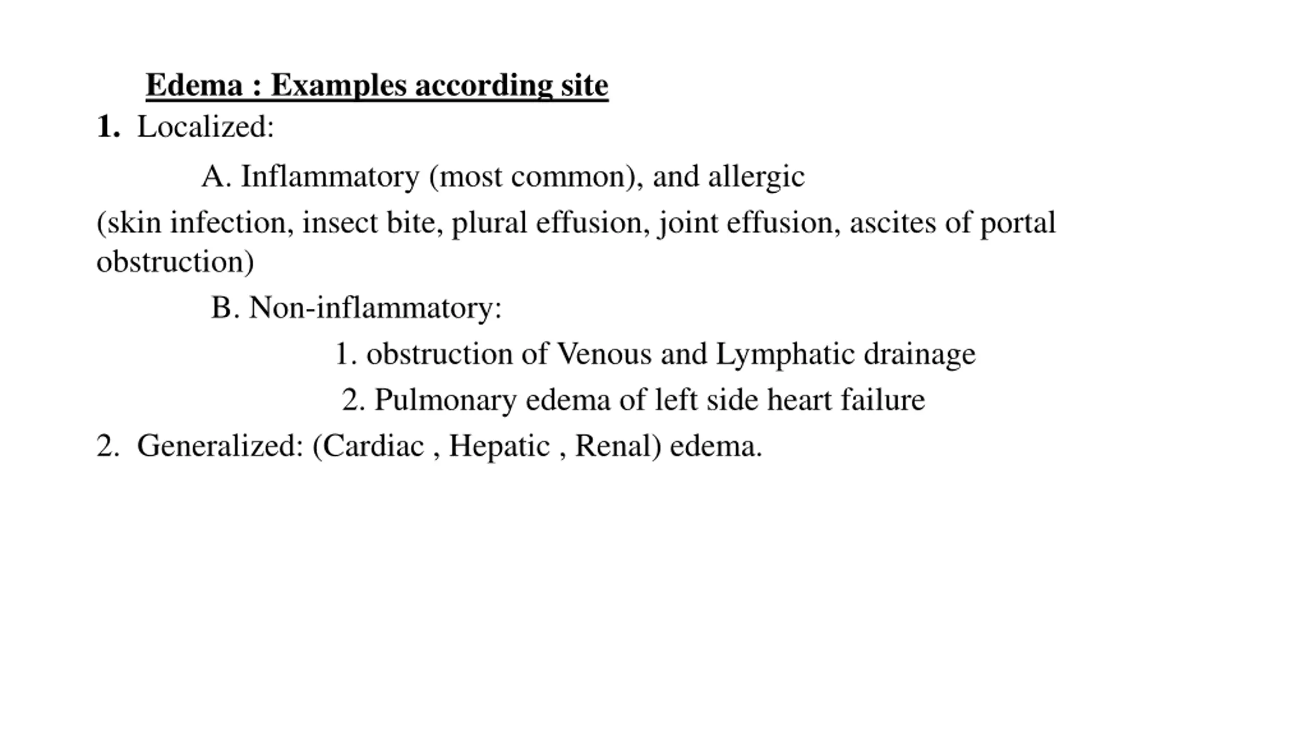 Edema : Examples according site 1. Localized: A. Inflammatory (most common), and allergic (skin infection, insect bite, plural effusion, joint effusion, ascites of portal obstruction) B. Non-inflammatory: 1. obstruction of Venous and Lymphatic drainage 2. Pulmonary edema of left side heart failure 2. Generalized: (Cardiac , Hepatic , Renal) edema.