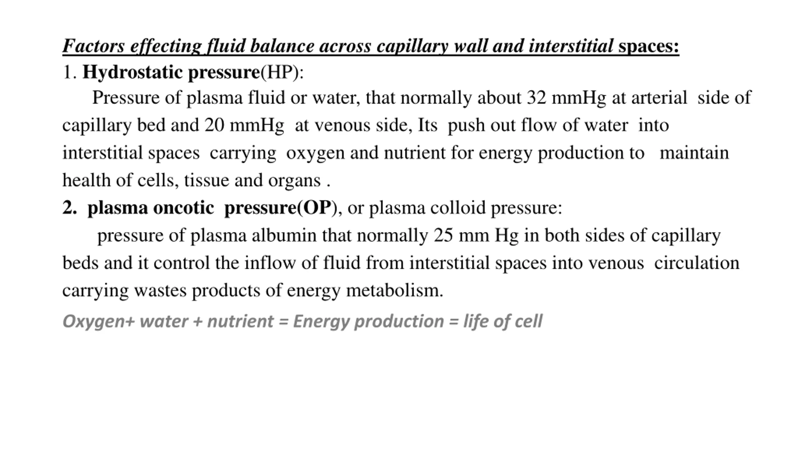 Factors effecting fluid balance across capillary wall and interstitial spaces: 1. Hydrostatic pressure(HP): Pressure of plasma fluid or water, that normally about 32 mmHg at arterial side of capillary bed and 20 mmHg at venous side, Its push out flow of water into interstitial spaces carrying oxygen and nutrient for energy production to maintain health of cells, tissue and organs . 2. plasma oncotic pressure(OP), or plasma colloid pressure: pressure of plasma albumin that normally 25 mm Hg in both sides of capillary beds and it control the inflow of fluid from interstitial spaces into venous circulation carrying wastes products of energy metabolism. Oxygen+ water + nutrient = Energy production = life of cell
