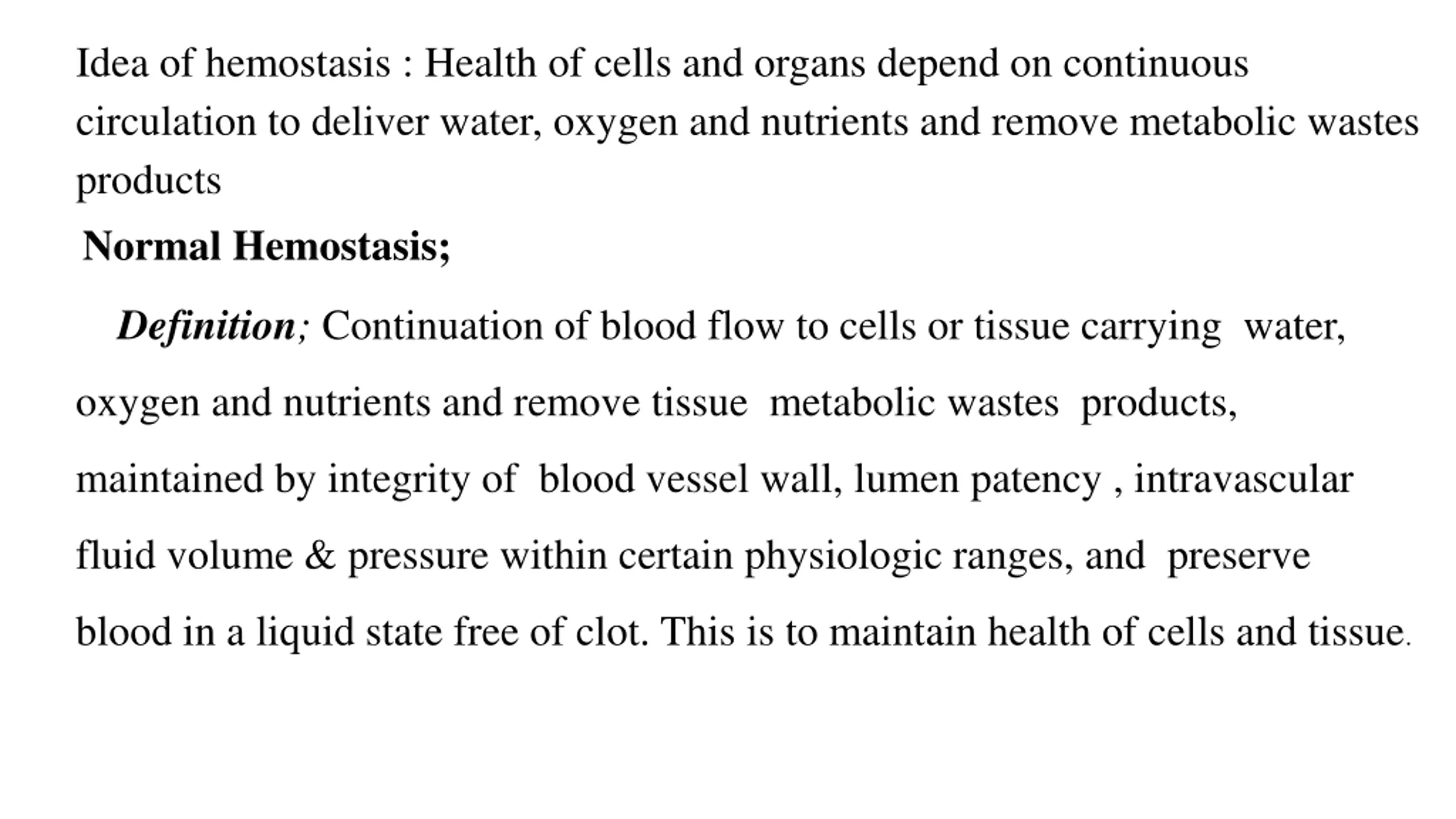Idea of hemostasis : Health of cells and organs depend on continuous circulation to deliver water, oxygen and nutrients and remove metabolic wastes products Normal Hemostasis; Definition; Continuation of blood flow to cells or tissue carrying water, oxygen and nutrients and remove tissue metabolic wastes products, maintained by integrity of blood vessel wall, lumen patency , intravascular fluid volume & pressure within certain physiologic ranges, and preserve blood in a liquid state free of clot. This is to maintain health of cells and tissue.
