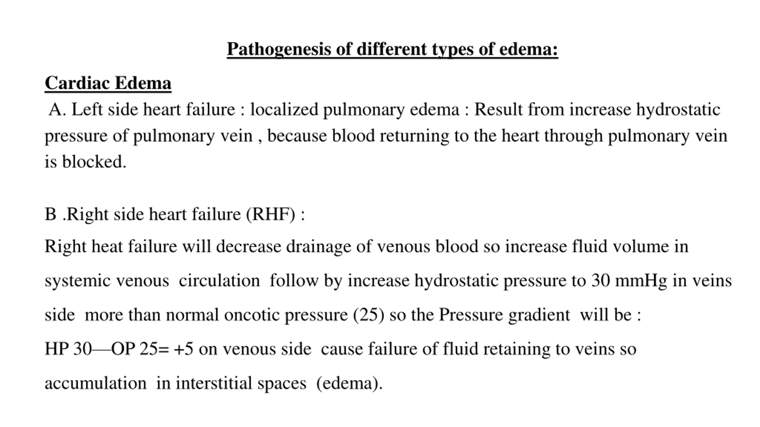 Pathogenesis of different types of edema: Cardiac Edema A. Left side heart failure : localized pulmonary edema : Result from increase hydrostatic pressure of pulmonary vein , because blood returning to the heart through pulmonary vein is blocked. B .Right side heart failure (RHF) : Right heat failure will decrease drainage of venous blood so increase fluid volume in systemic venous circulation follow by increase hydrostatic pressure to 30 mmHg in veins side more than normal oncotic pressure (25) so the Pressure gradient will be : HP 30 OP 25= +5 on venous side cause failure of fluid retaining to veins so accumulation in interstitial spaces (edema).