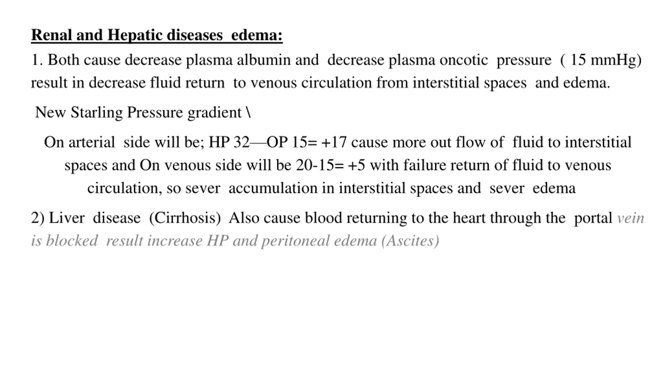 Renal and Hepatic diseases edema: 1. Both cause decrease plasma albumin and decrease plasma oncotic pressure ( 15 mmHg) result in decrease fluid return to venous circulation from interstitial spaces and edema. New Starling Pressure gradient \ On arterial side will be; HP 32 OP 15= +17 cause more out flow of fluid to interstitial spaces and On venous side will be 20-15= +5 with failure return of fluid to venous circulation, so sever accumulation in interstitial spaces and sever edema 2) Liver disease (Cirrhosis) Also cause blood returning to the heart through the portal vein is blocked result increase HP and peritoneal edema (Ascites)