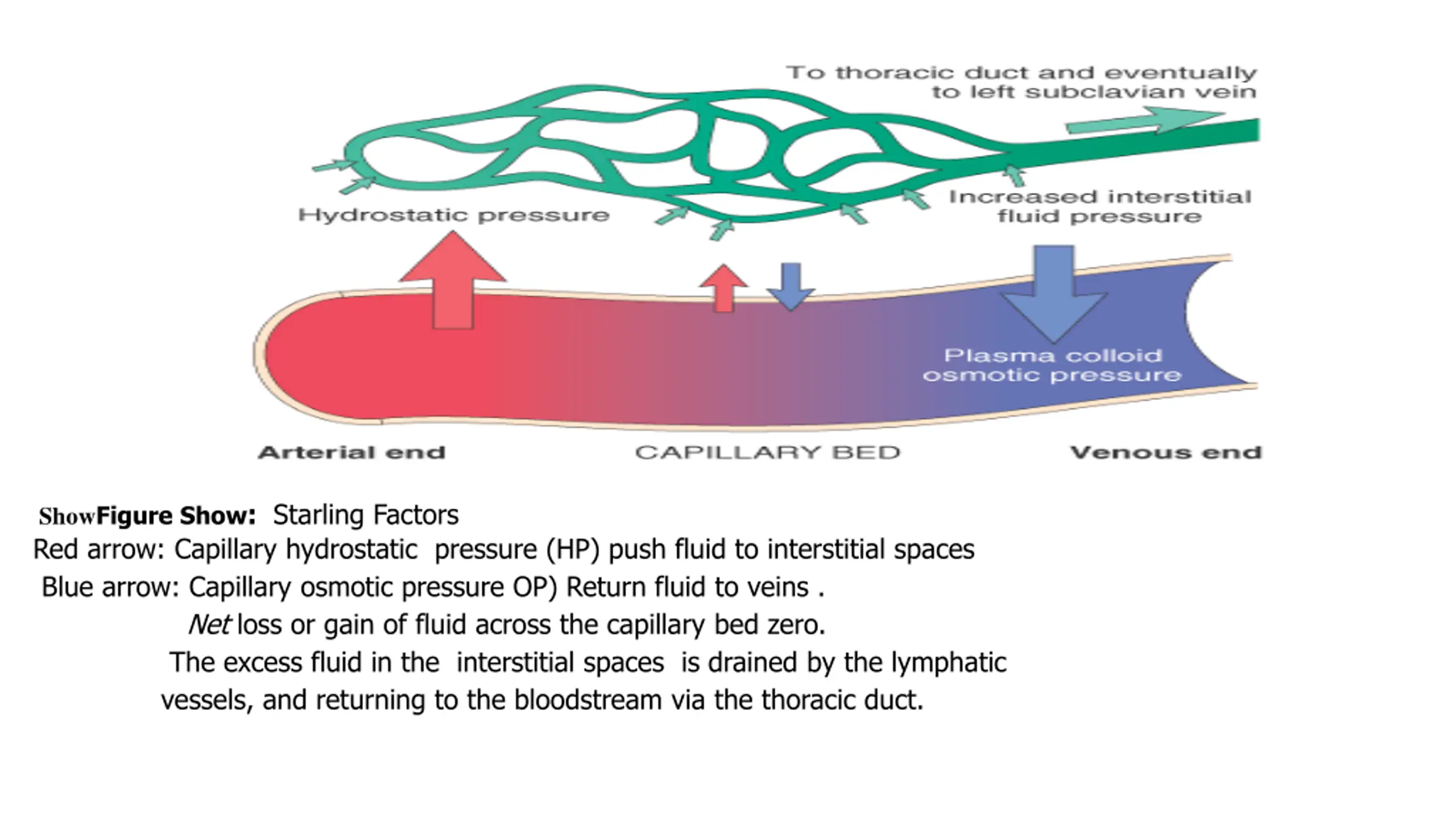 ShowFigure Show: Starling Factors Red arrow: Capillary hydrostatic pressure (HP) push fluid to interstitial spaces Blue arrow: Capillary osmotic pressure OP) Return fluid to veins . Net loss or gain of fluid across the capillary bed zero. The excess fluid in the interstitial spaces is drained by the lymphatic vessels, and returning to the bloodstream via the thoracic duct.