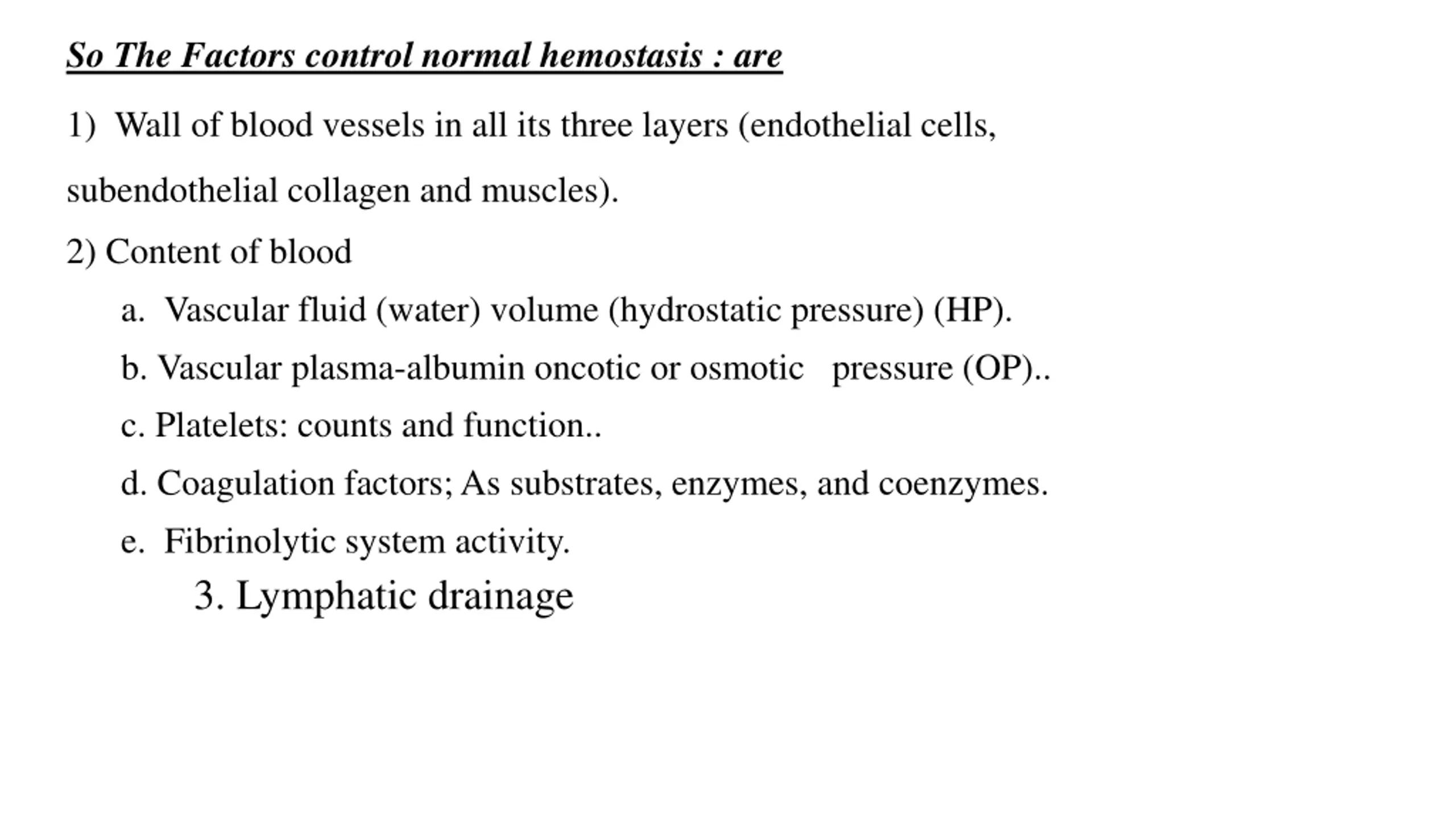 So The Factors control normal hemostasis : are 1) Wall of blood vessels in all its three layers (endothelial cells, subendothelial collagen and muscles). 2) Content of blood a. Vascular fluid (water) volume (hydrostatic pressure) (HP). b. Vascular plasma-albumin oncotic or osmotic pressure (OP).. c. Platelets: counts and function.. d. Coagulation factors; As substrates, enzymes, and coenzymes. e. Fibrinolytic system activity. 3. Lymphatic drainage