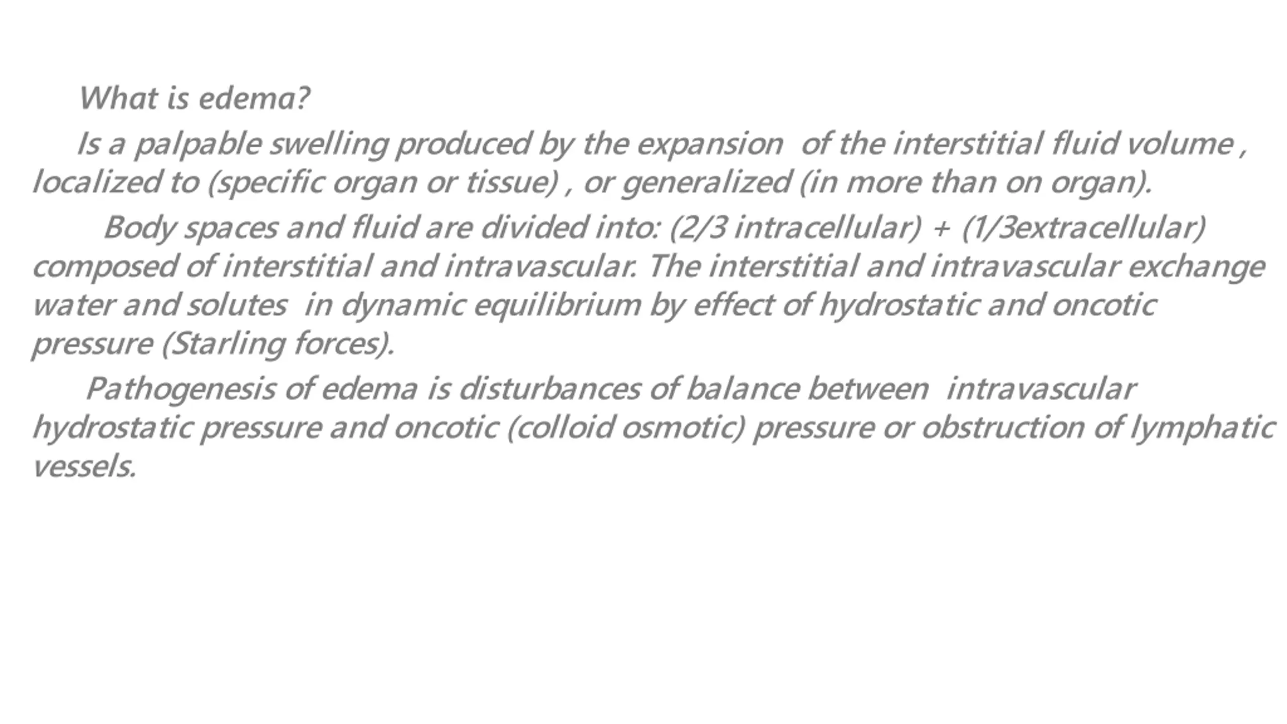 What is edema? Is a palpable swelling produced by the expansion of the interstitial fluid volume , localized to (specific organ or tissue) , or generalized (in more than on organ). Body spaces and fluid are divided into: (2/3 intracellular) + (1/3extracellular) composed of interstitial and intravascular. The interstitial and intravascular exchange water and solutes in dynamic equilibrium by effect of hydrostatic and oncotic pressure (Starling forces). Pathogenesis of edema is disturbances of balance between intravascular hydrostatic pressure and oncotic (colloid osmotic) pressure or obstruction of lymphatic vessels.