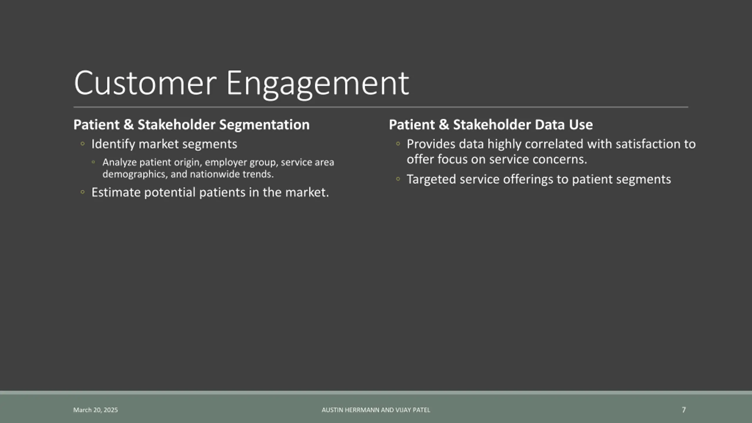 Customer Engagement Patient & Stakeholder Segmentation Identify market segments Patient & Stakeholder Data Use Provides data highly correlated with satisfaction to offer focus on service concerns. Targeted service offerings to patient segments Analyze patient origin, employer group, service area demographics, and nationwide trends. Estimate potential patients in the market. 7 March 20, 2025 AUSTIN HERRMANN AND VIJAY PATEL