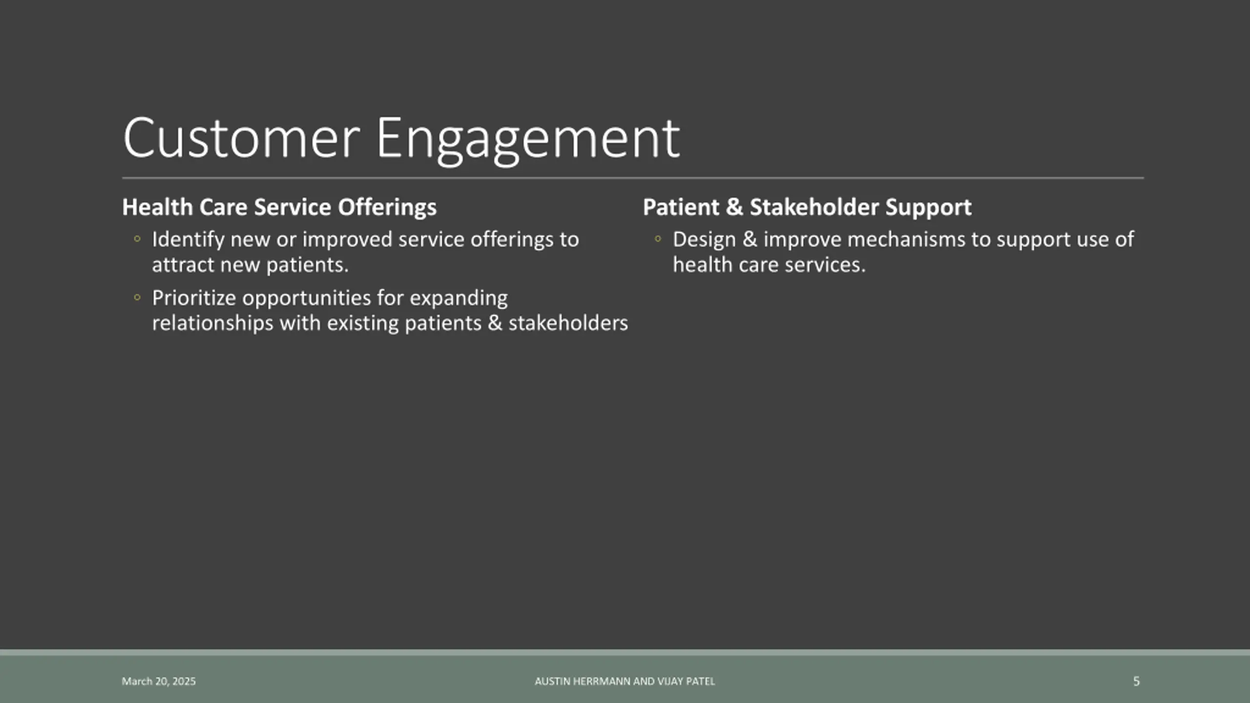 Customer Engagement Health Care Service Offerings Identify new or improved service offerings to attract new patients. Prioritize opportunities for expanding relationships with existing patients & stakeholders Patient & Stakeholder Support Design & improve mechanisms to support use of health care services. 5 March 20, 2025 AUSTIN HERRMANN AND VIJAY PATEL