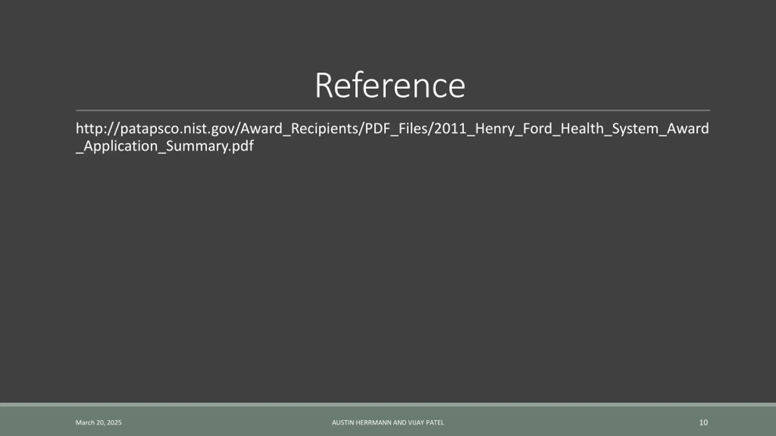 Reference http://patapsco.nist.gov/Award_Recipients/PDF_Files/2011_Henry_Ford_Health_System_Award _Application_Summary.pdf 10 March 20, 2025 AUSTIN HERRMANN AND VIJAY PATEL