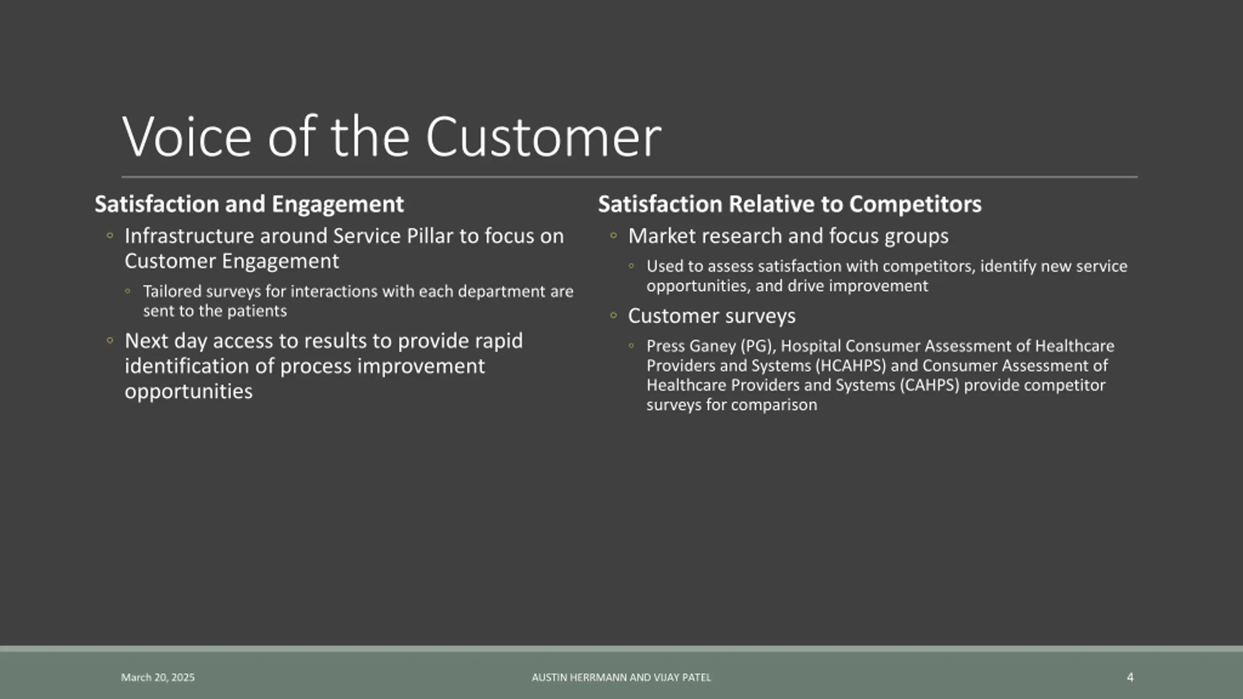 Voice of the Customer Satisfaction and Engagement Infrastructure around Service Pillar to focus on Customer Engagement Satisfaction Relative to Competitors Market research and focus groups Used to assess satisfaction with competitors, identify new service opportunities, and drive improvement Customer surveys Tailored surveys for interactions with each department are sent to the patients Next day access to results to provide rapid identification of process improvement opportunities Press Ganey (PG), Hospital Consumer Assessment of Healthcare Providers and Systems (HCAHPS) and Consumer Assessment of Healthcare Providers and Systems (CAHPS) provide competitor surveys for comparison 4 March 20, 2025 AUSTIN HERRMANN AND VIJAY PATEL