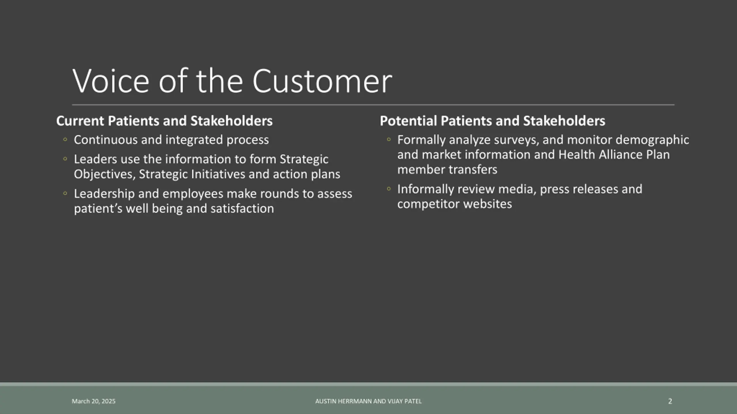 Voice of the Customer Current Patients and Stakeholders Continuous and integrated process Leaders use the information to form Strategic Objectives, Strategic Initiatives and action plans Leadership and employees make rounds to assess patient s well being and satisfaction Potential Patients and Stakeholders Formally analyze surveys, and monitor demographic and market information and Health Alliance Plan member transfers Informally review media, press releases and competitor websites 2 March 20, 2025 AUSTIN HERRMANN AND VIJAY PATEL