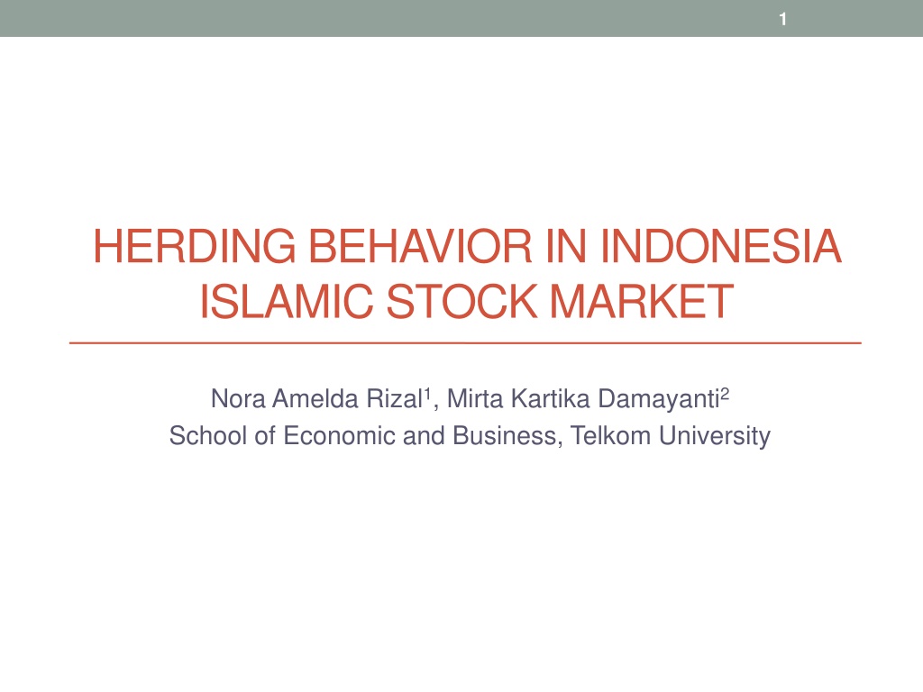 1 HERDING BEHAVIOR IN INDONESIA ISLAMIC STOCK MARKET Nora Amelda Rizal1, Mirta Kartika Damayanti2 School of Economic and Business, Telkom University