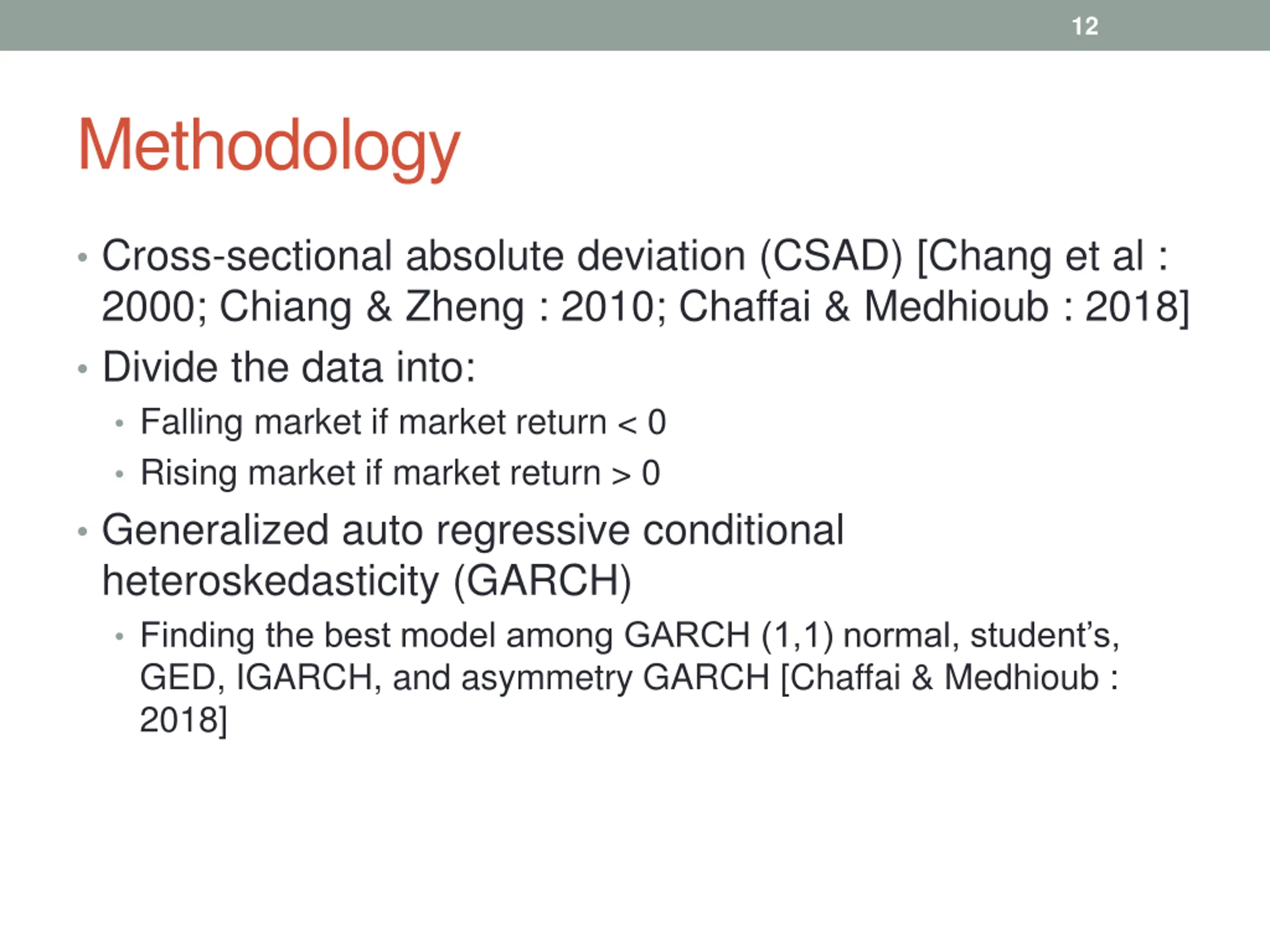 12 Methodology Cross-sectional absolute deviation (CSAD) [Chang et al : 2000; Chiang & Zheng : 2010; Chaffai & Medhioub : 2018] Divide the data into: Falling market if market return < 0 Rising market if market return > 0 Generalized auto regressive conditional heteroskedasticity (GARCH) Finding the best model among GARCH (1,1) normal, student s, GED, IGARCH, and asymmetry GARCH [Chaffai & Medhioub : 2018]