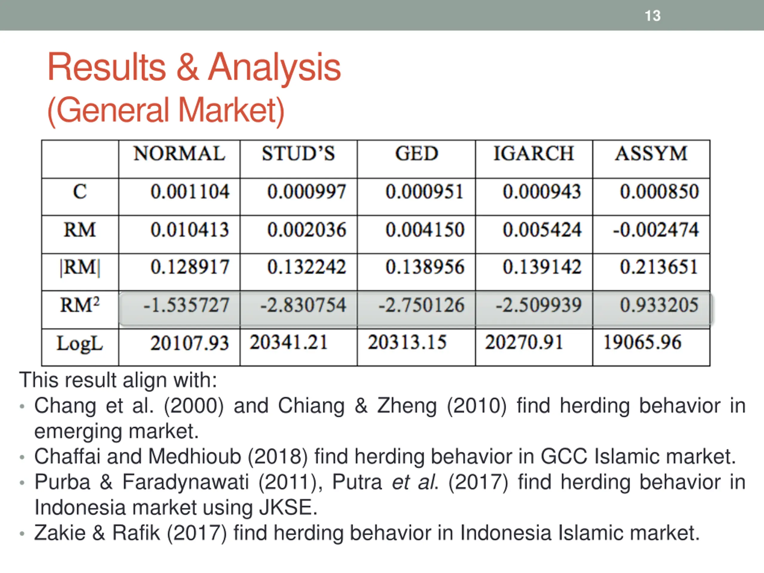 13 Results & Analysis (General Market) This result align with: Chang et al. (2000) and Chiang & Zheng (2010) find herding behavior in emerging market. Chaffai and Medhioub (2018) find herding behavior in GCC Islamic market. Purba & Faradynawati (2011), Putra et al. (2017) find herding behavior in Indonesia market using JKSE. Zakie & Rafik (2017) find herding behavior in Indonesia Islamic market.
