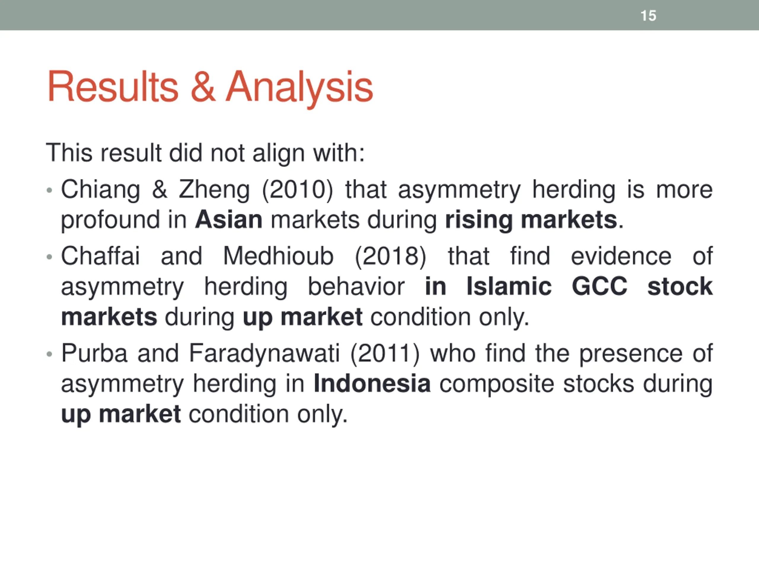 15 Results & Analysis This result did not align with: Chiang & Zheng (2010) that asymmetry herding is more profound in Asian markets during rising markets. Chaffai and Medhioub (2018) that find evidence of asymmetry herding behavior in Islamic GCC stock markets during up market condition only. Purba and Faradynawati (2011) who find the presence of asymmetry herding in Indonesia composite stocks during up market condition only.