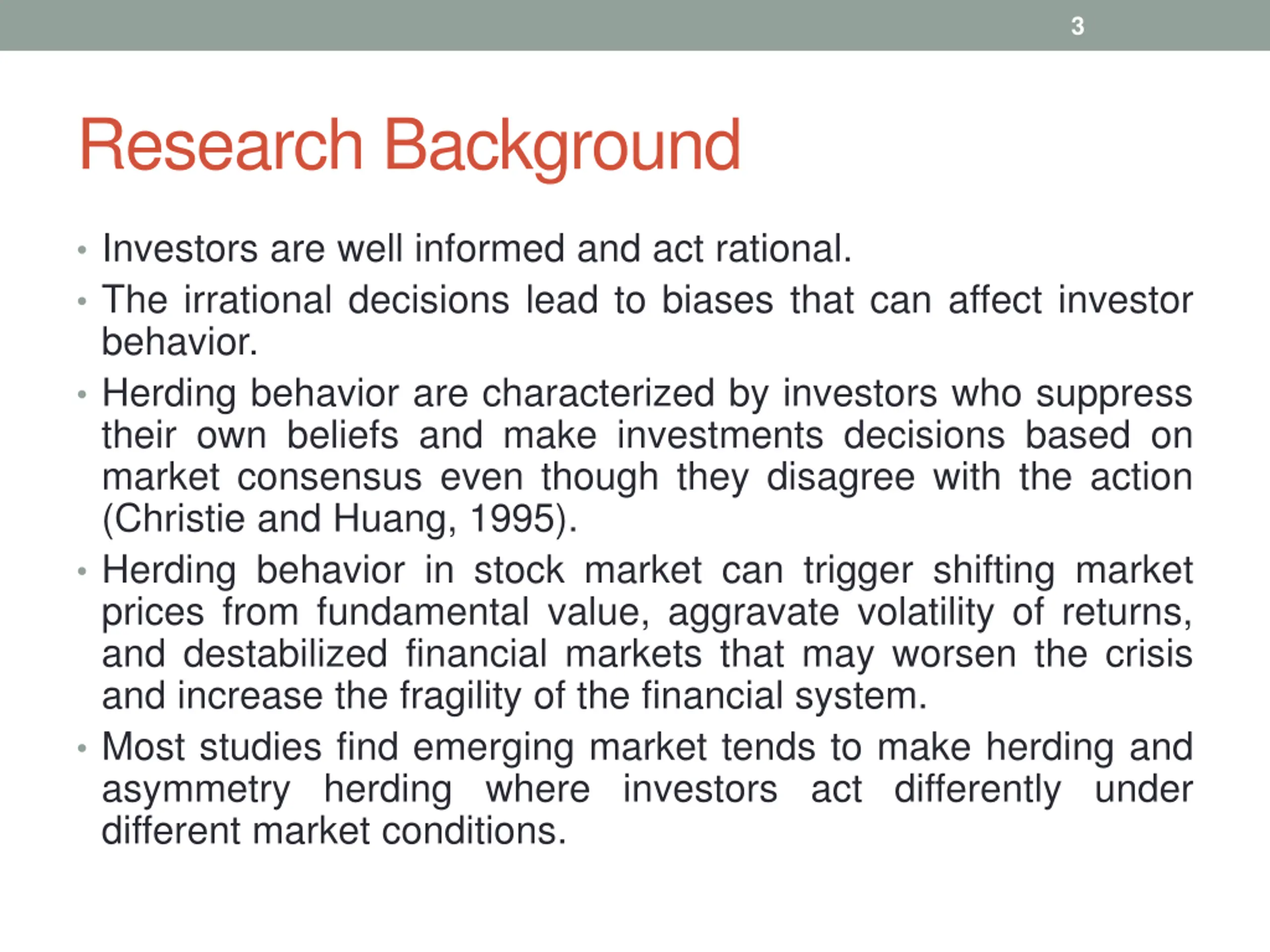 3 Research Background Investors are well informed and act rational. The irrational decisions lead to biases that can affect investor behavior. Herding behavior are characterized by investors who suppress their own beliefs and make investments decisions based on market consensus even though they disagree with the action (Christie and Huang, 1995). Herding behavior in stock market can trigger shifting market prices from fundamental value, aggravate volatility of returns, and destabilized financial markets that may worsen the crisis and increase the fragility of the financial system. Most studies find emerging market tends to make herding and asymmetry herding where investors act differently under different market conditions.