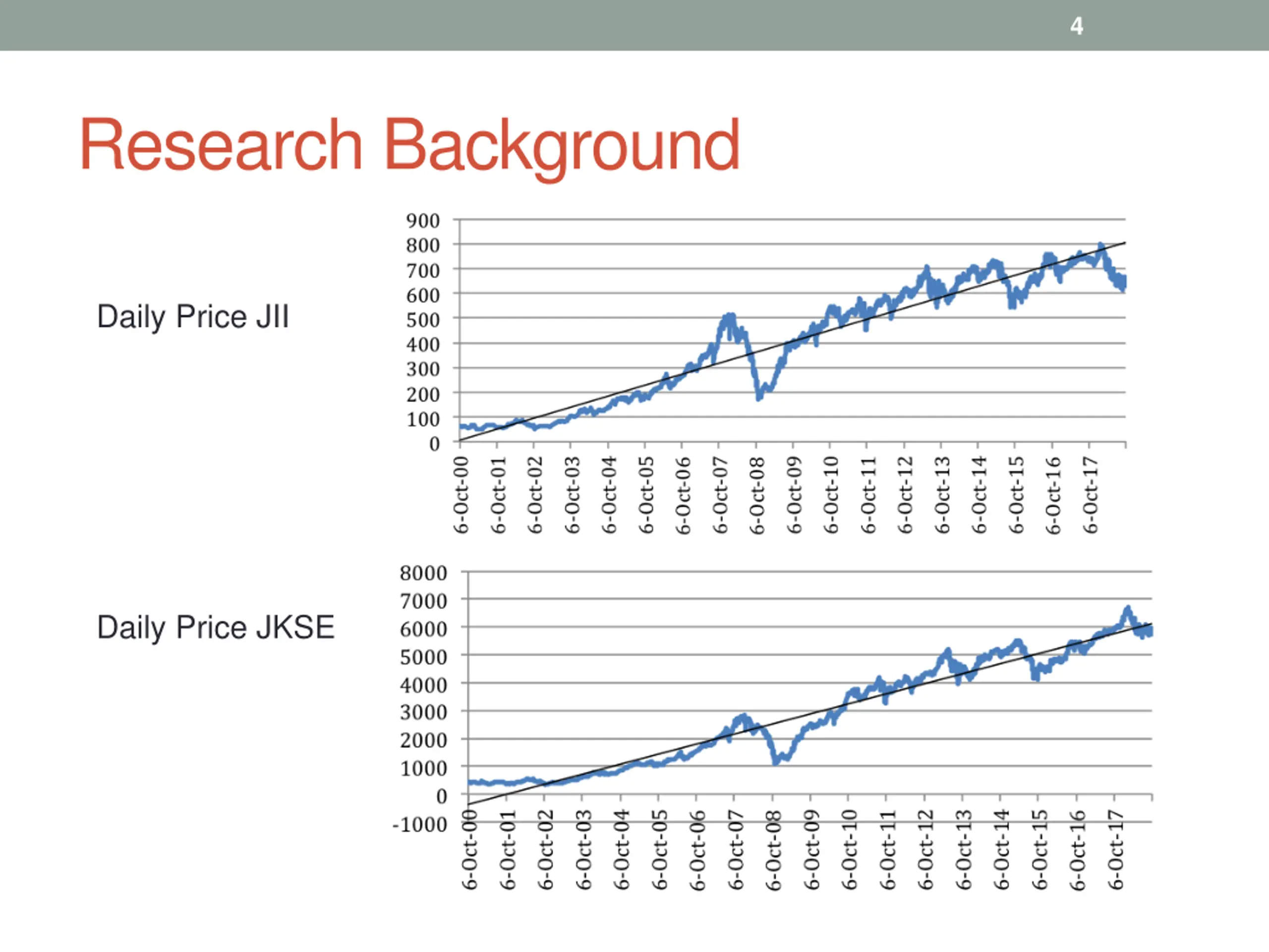 11 Data Daily price data of JII and JKSE from 6 October 2000 to 5 October 2018. Convert daily price stock data to return stock data. JII as individual return JKSE as portfolio return