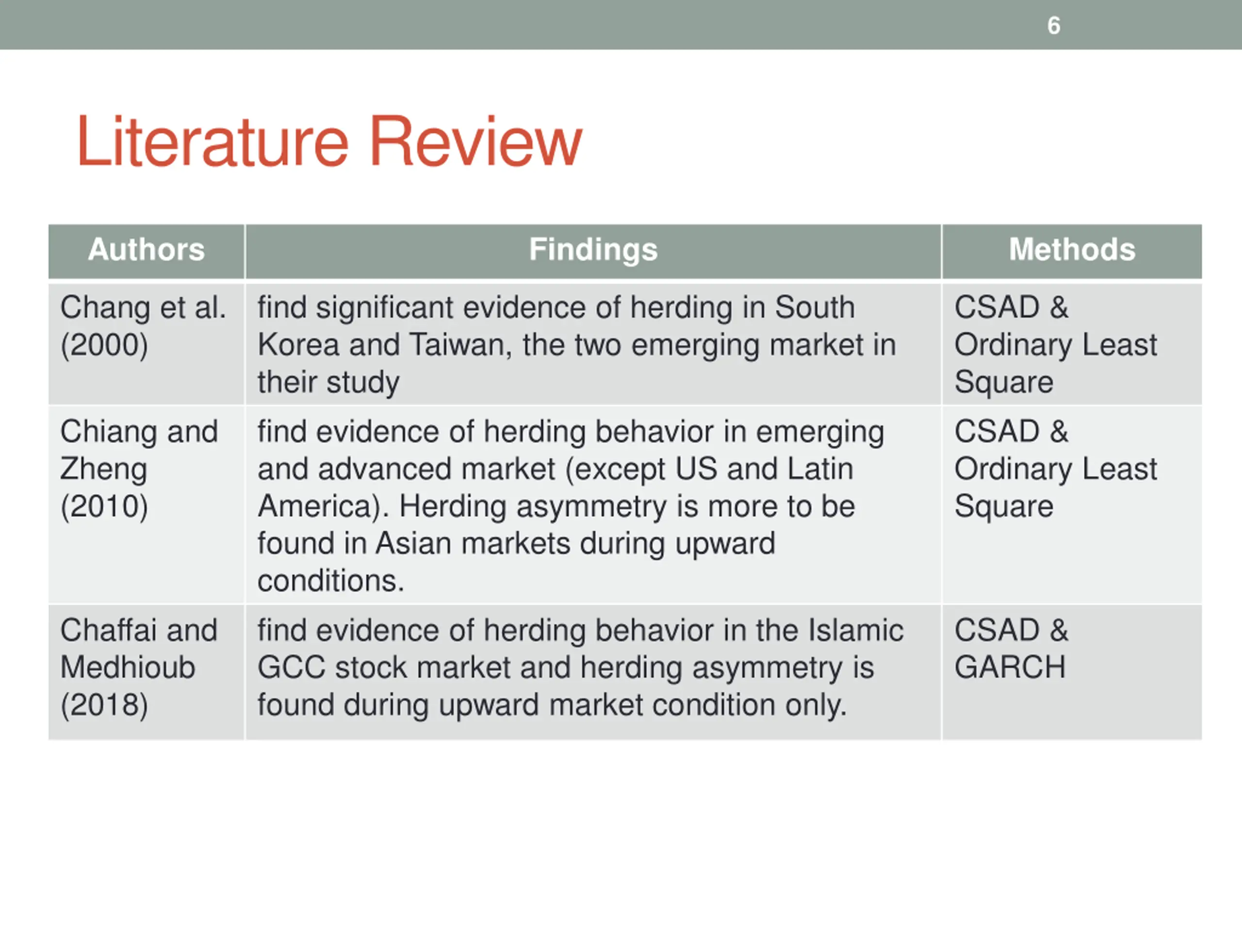 6 Literature Review Authors Findings Methods Chang et al. (2000) find significant evidence of herding in South Korea and Taiwan, the two emerging market in their study find evidence of herding behavior in emerging and advanced market (except US and Latin America). Herding asymmetry is more to be found in Asian markets during upward conditions. find evidence of herding behavior in the Islamic GCC stock market and herding asymmetry is found during upward market condition only. CSAD & Ordinary Least Square CSAD & Ordinary Least Square Chiang and Zheng (2010) Chaffai and Medhioub (2018) CSAD & GARCH