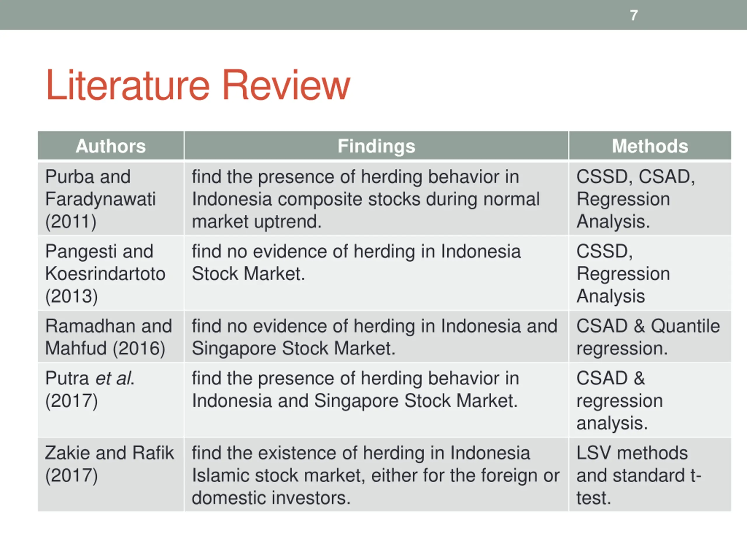 7 Literature Review Authors Purba and Faradynawati (2011) Pangesti and Koesrindartoto (2013) Ramadhan and Mahfud (2016) Putra et al. (2017) Findings Methods CSSD, CSAD, Regression Analysis. CSSD, Regression Analysis CSAD & Quantile regression. CSAD & regression analysis. LSV methods and standard t- test. find the presence of herding behavior in Indonesia composite stocks during normal market uptrend. find no evidence of herding in Indonesia Stock Market. find no evidence of herding in Indonesia and Singapore Stock Market. find the presence of herding behavior in Indonesia and Singapore Stock Market. Zakie and Rafik (2017) find the existence of herding in Indonesia Islamic stock market, either for the foreign or domestic investors.