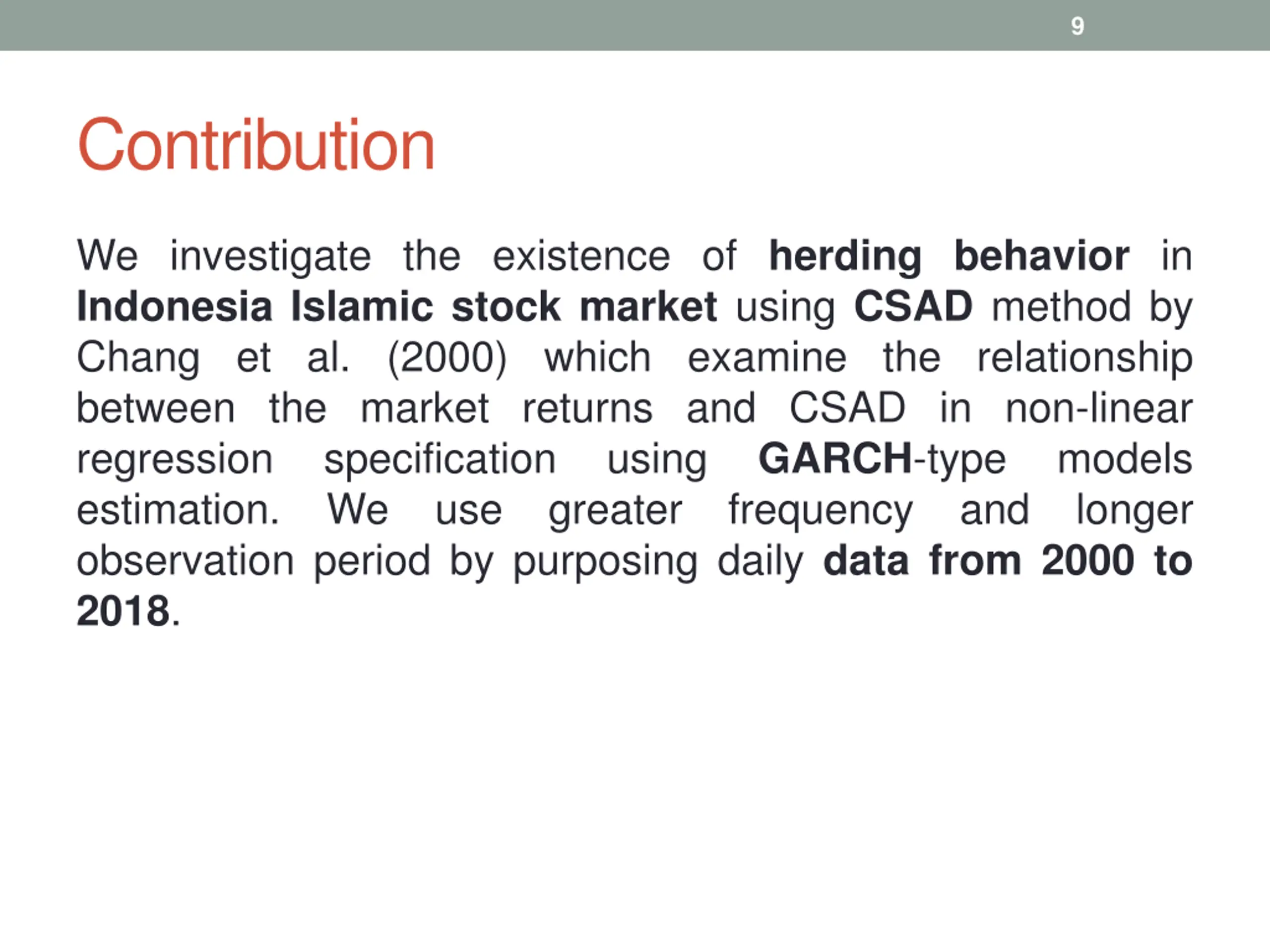 9 Contribution We investigate the existence of herding behavior in Indonesia Islamic stock market using CSAD method by Chang et al. (2000) which examine the relationship between the market returns and CSAD in non-linear regression specification using GARCH-type models estimation. We use greater frequency and longer observation period by purposing daily data from 2000 to 2018.
