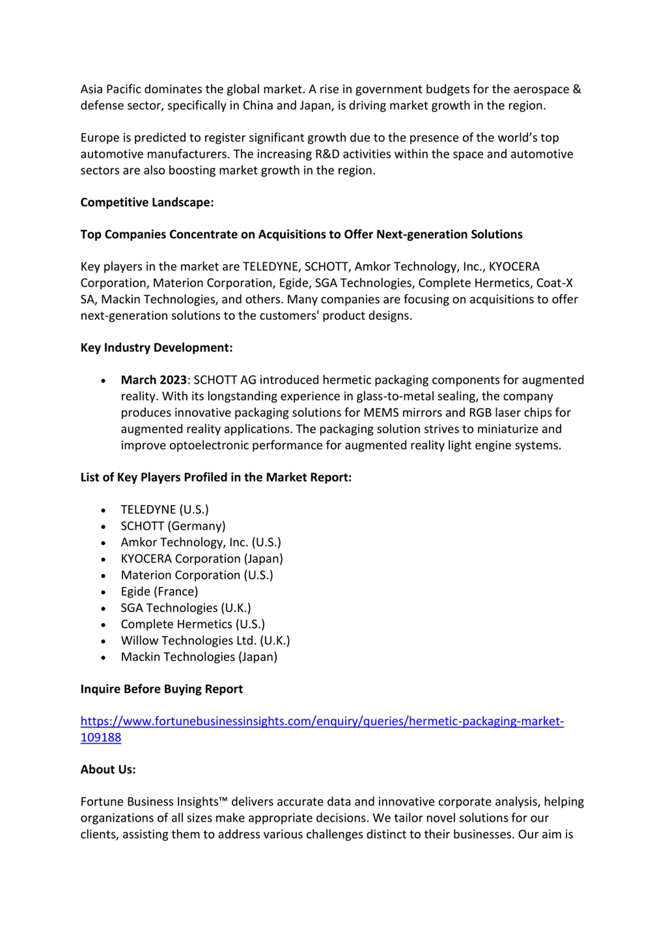 Asia Pacific dominates the global market. A rise in government budgets for the aerospace & defense sector, specifically in China and Japan, is driving market growth in the region. Europe is predicted to register significant growth due to the presence of the world s top automotive manufacturers. The increasing R&D activities within the space and automotive sectors are also boosting market growth in the region. Competitive Landscape: Top Companies Concentrate on Acquisitions to Offer Next-generation Solutions Key players in the market are TELEDYNE, SCHOTT, Amkor Technology, Inc., KYOCERA Corporation, Materion Corporation, Egide, SGA Technologies, Complete Hermetics, Coat-X SA, Mackin Technologies, and others. Many companies are focusing on acquisitions to offer next-generation solutions to the customers' product designs. Key Industry Development: March 2023: SCHOTT AG introduced hermetic packaging components for augmented reality. With its longstanding experience in glass-to-metal sealing, the company produces innovative packaging solutions for MEMS mirrors and RGB laser chips for augmented reality applications. The packaging solution strives to miniaturize and improve optoelectronic performance for augmented reality light engine systems. List of Key Players Profiled in the Market Report: TELEDYNE (U.S.) SCHOTT (Germany) Amkor Technology, Inc. (U.S.) KYOCERA Corporation (Japan) Materion Corporation (U.S.) Egide (France) SGA Technologies (U.K.) Complete Hermetics (U.S.) Willow Technologies Ltd. (U.K.) Mackin Technologies (Japan) Inquire Before Buying Report https://www.fortunebusinessinsights.com/enquiry/queries/hermetic-packaging-market- 109188 About Us: Fortune Business Insights delivers accurate data and innovative corporate analysis, helping organizations of all sizes make appropriate decisions. We tailor novel solutions for our clients, assisting them to address various challenges distinct to their businesses. Our aim is