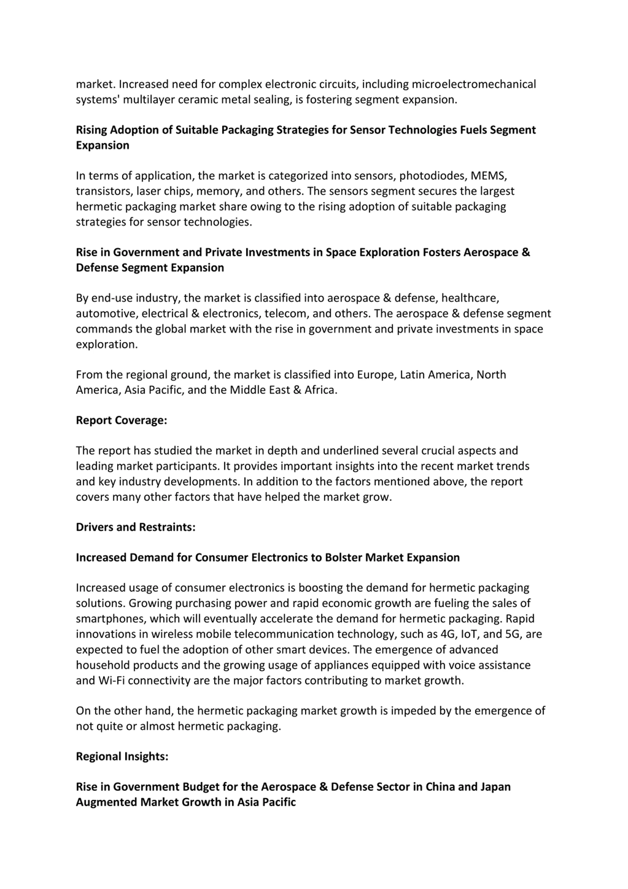 market. Increased need for complex electronic circuits, including microelectromechanical systems' multilayer ceramic metal sealing, is fostering segment expansion. Rising Adoption of Suitable Packaging Strategies for Sensor Technologies Fuels Segment Expansion In terms of application, the market is categorized into sensors, photodiodes, MEMS, transistors, laser chips, memory, and others. The sensors segment secures the largest hermetic packaging market share owing to the rising adoption of suitable packaging strategies for sensor technologies. Rise in Government and Private Investments in Space Exploration Fosters Aerospace & Defense Segment Expansion By end-use industry, the market is classified into aerospace & defense, healthcare, automotive, electrical & electronics, telecom, and others. The aerospace & defense segment commands the global market with the rise in government and private investments in space exploration. From the regional ground, the market is classified into Europe, Latin America, North America, Asia Pacific, and the Middle East & Africa. Report Coverage: The report has studied the market in depth and underlined several crucial aspects and leading market participants. It provides important insights into the recent market trends and key industry developments. In addition to the factors mentioned above, the report covers many other factors that have helped the market grow. Drivers and Restraints: Increased Demand for Consumer Electronics to Bolster Market Expansion Increased usage of consumer electronics is boosting the demand for hermetic packaging solutions. Growing purchasing power and rapid economic growth are fueling the sales of smartphones, which will eventually accelerate the demand for hermetic packaging. Rapid innovations in wireless mobile telecommunication technology, such as 4G, IoT, and 5G, are expected to fuel the adoption of other smart devices. The emergence of advanced household products and the growing usage of appliances equipped with voice assistance and Wi-Fi connectivity are the major factors contributing to market growth. On the other hand, the hermetic packaging market growth is impeded by the emergence of not quite or almost hermetic packaging. Regional Insights: Rise in Government Budget for the Aerospace & Defense Sector in China and Japan Augmented Market Growth in Asia Pacific