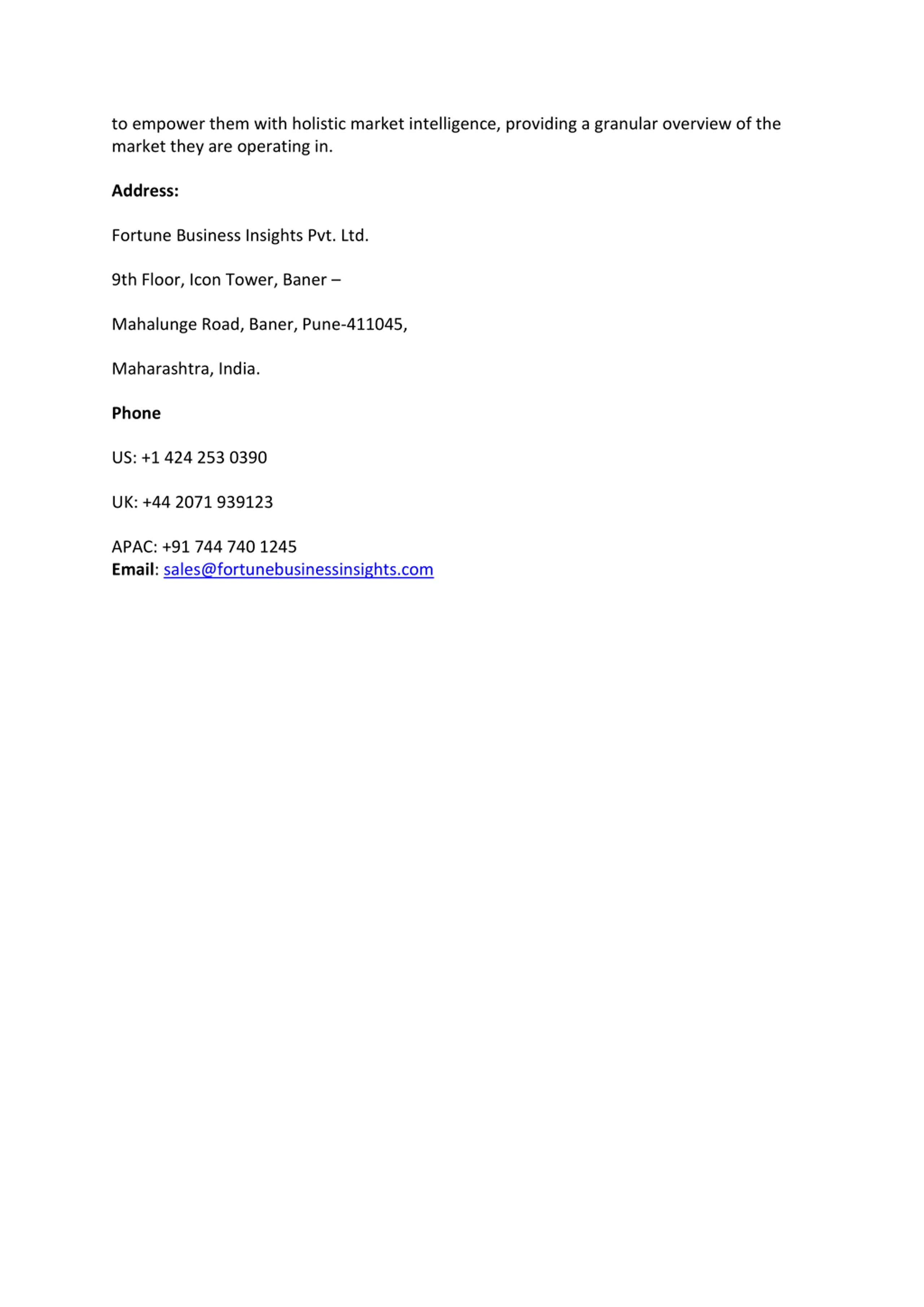 to empower them with holistic market intelligence, providing a granular overview of the market they are operating in. Address: Fortune Business Insights Pvt. Ltd. 9th Floor, Icon Tower, Baner Mahalunge Road, Baner, Pune-411045, Maharashtra, India. Phone US: +1 424 253 0390 UK: +44 2071 939123 APAC: +91 744 740 1245 Email: sales@fortunebusinessinsights.com