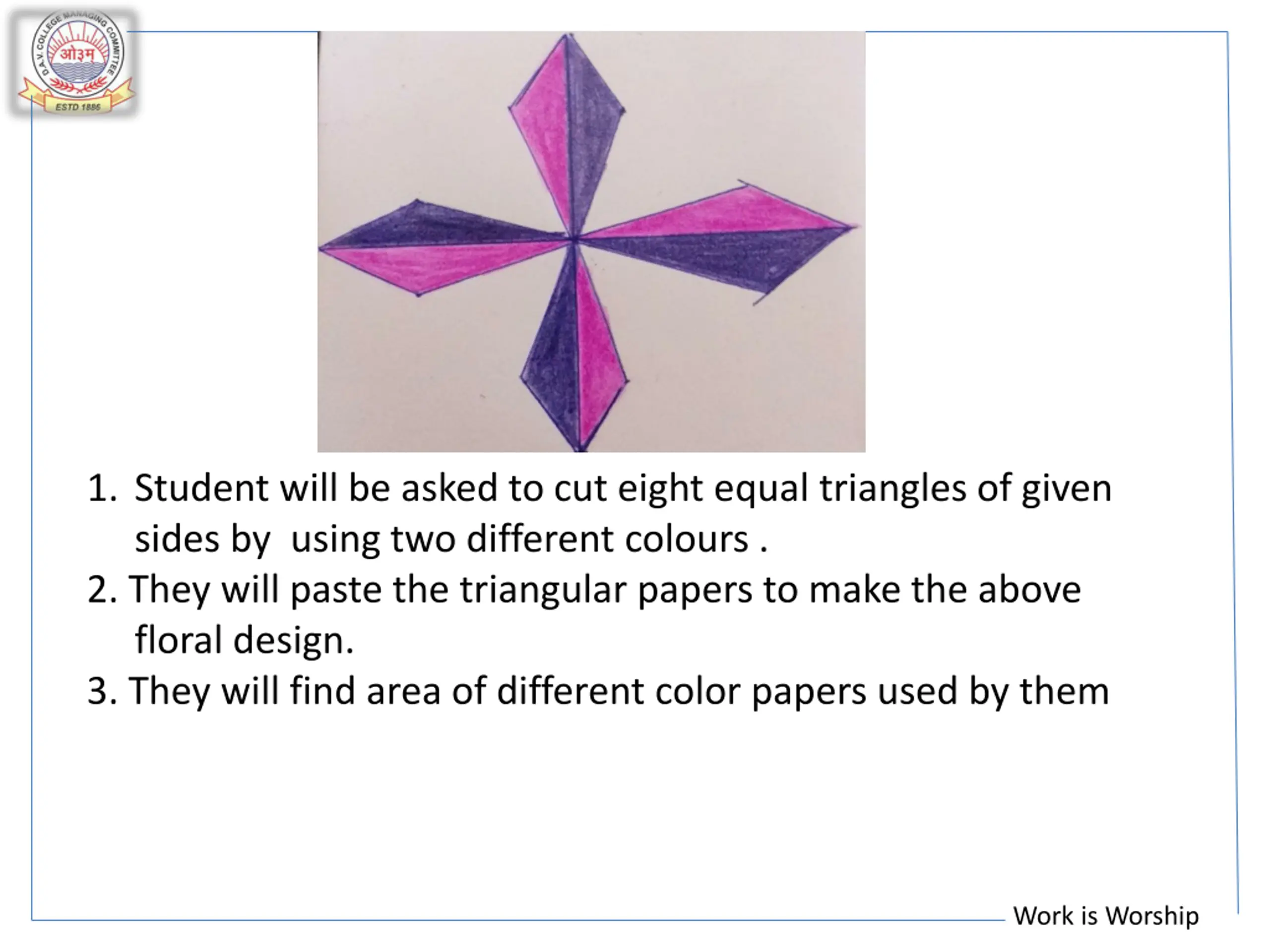 1. Student will be asked to cut eight equal triangles of given sides by using two different colours . 2. They will paste the triangular papers to make the above floral design. 3. They will find area of different color papers used by them Work is Worship