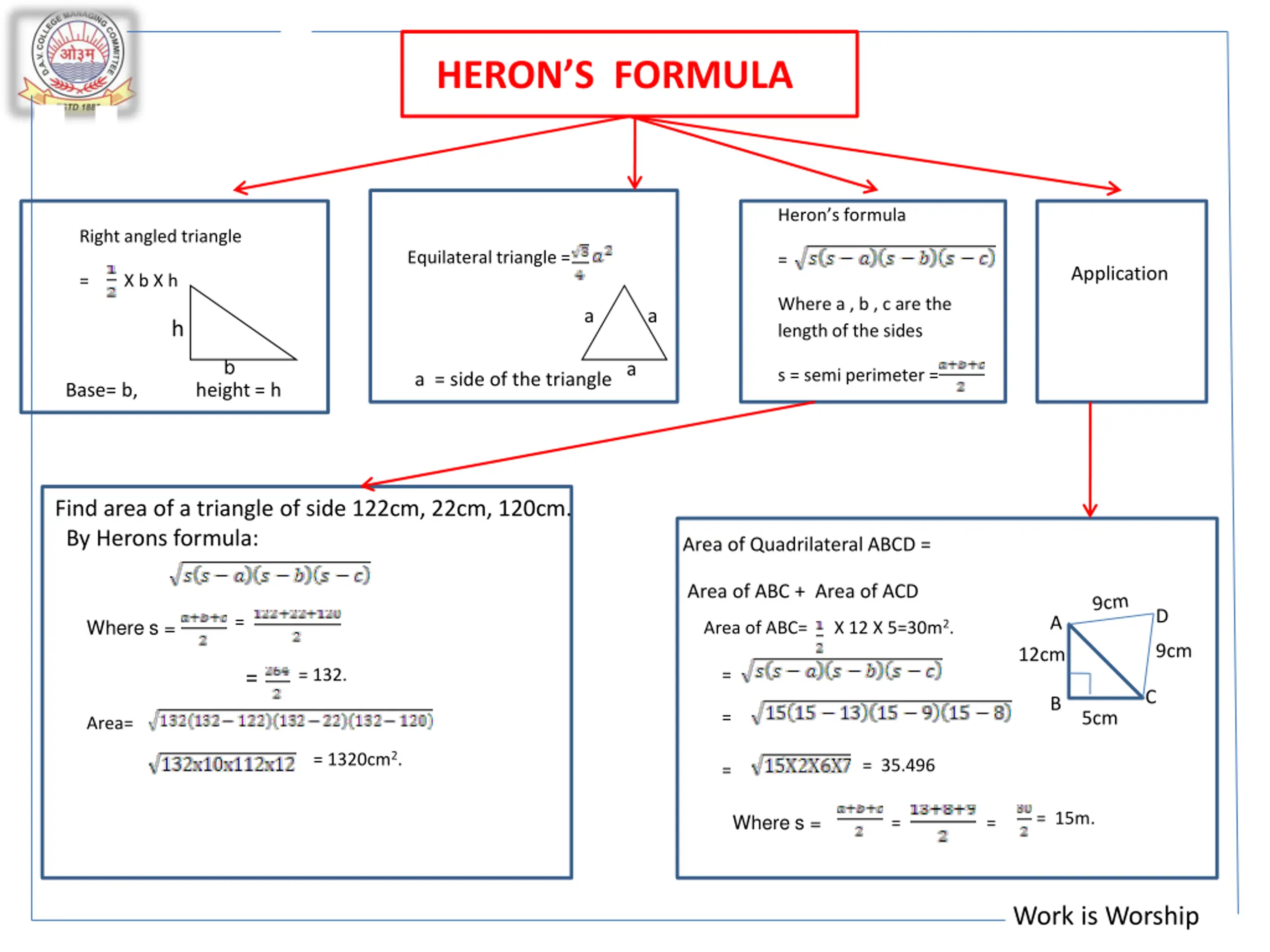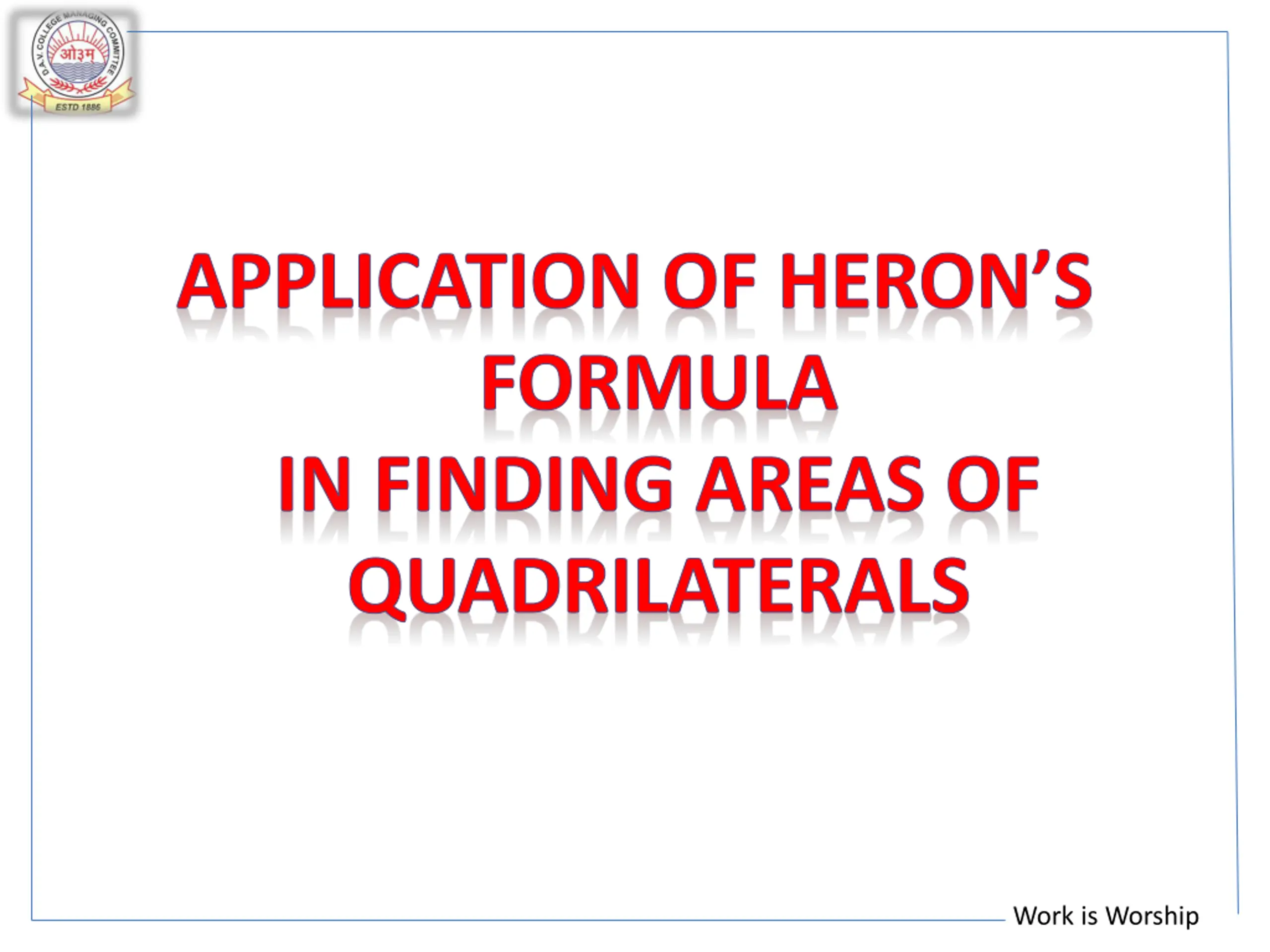 APPLICATION OF HERONS FORMULA IN FINDING AREAS OF QUADRILATERALS Work is Worship