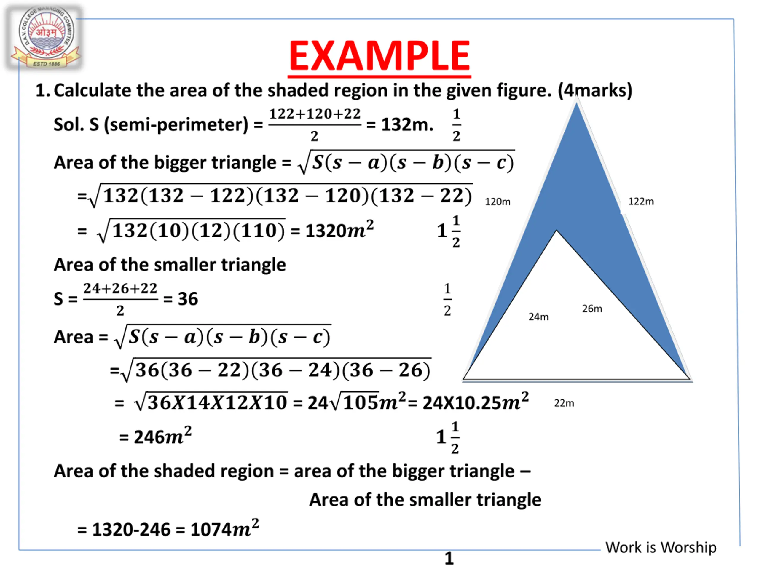 EXAMPLE 1.Calculate the area of the shaded region in the given figure. (4marks) Sol. S (semi-perimeter) = ???+???+?? ? Area of the bigger triangle = ? ? ? ? ? (? ?) = 132m. ? ? = ??? ??? ??? ??? ??? (??? ??) = ??? ?? ?? (???) = 1320???? 122m 120m ? Area of the smaller triangle S = ??+??+?? ? Area = ? ? ? ? ? (? ?) = 36 1 2 26m 24m = ?? ?? ?? ?? ?? (?? ??) = ??????????? = 24 ?????= 24X10.25?? = 246???? 22m ? Area of the shaded region = area of the bigger triangle Area of the smaller triangle = 1320-246 = 1074?? 1 Work is Worship