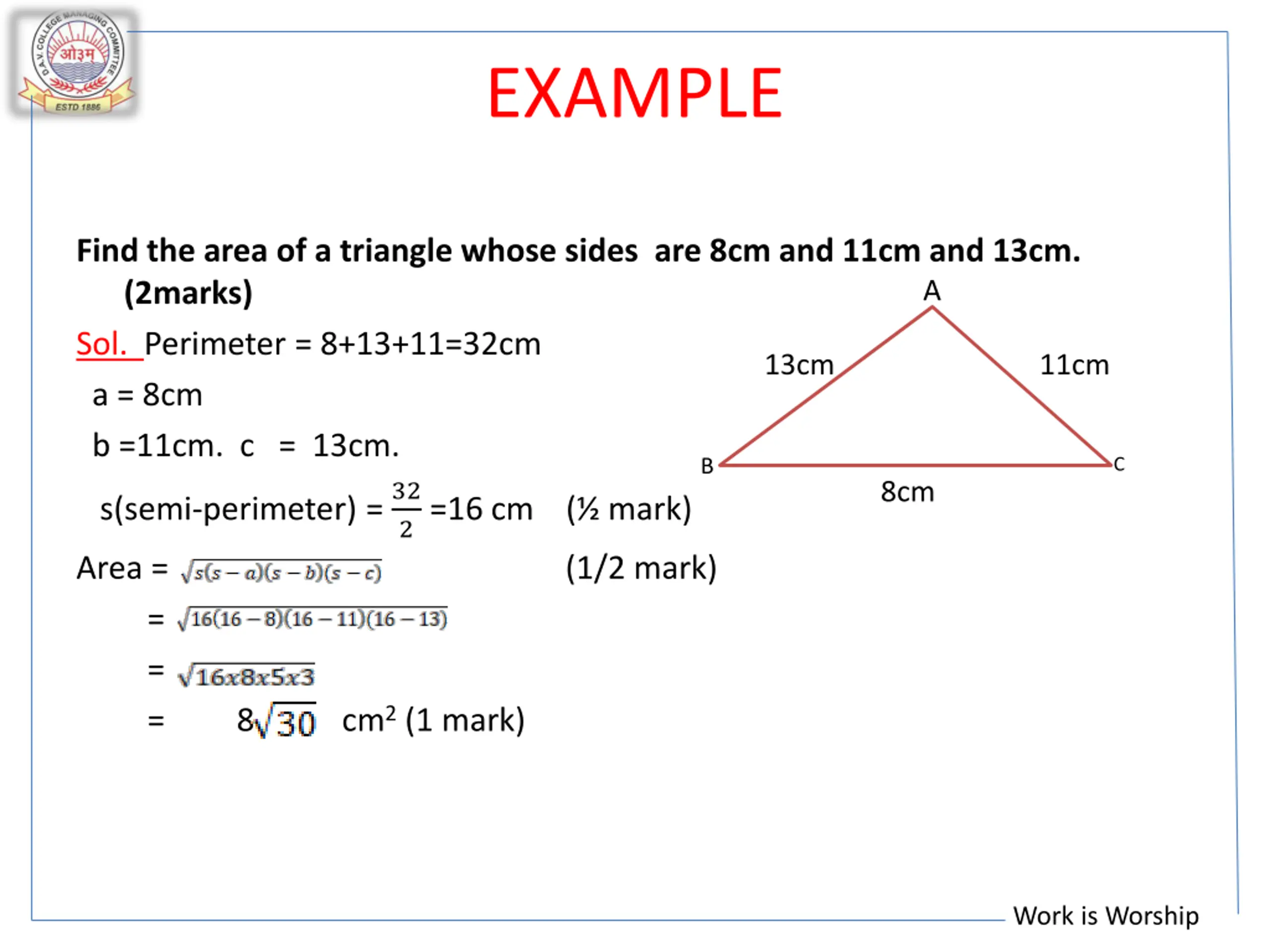 EXAMPLE Find the area of a triangle whose sides are 8cm and 11cm and 13cm. (2marks) Sol. Perimeter = 8+13+11=32cm a = 8cm b =11cm. c = 13cm. s(semi-perimeter) = 32 2 =16 cm ( mark) Area = (1/2 mark) = = = 8 cm2 (1 mark) A 13cm 11cm C B 8cm Work is Worship