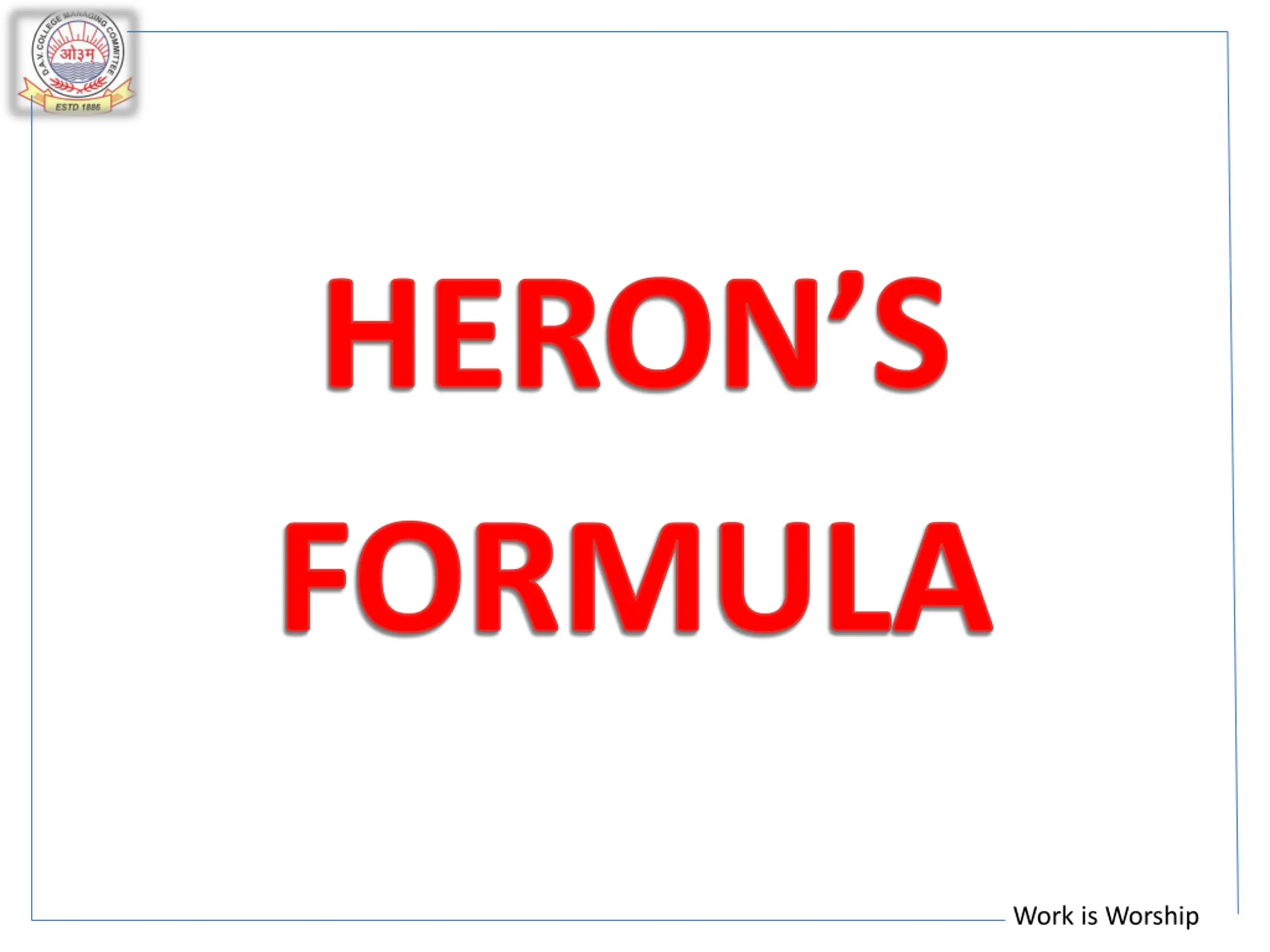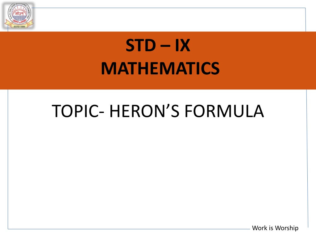 STD IX MATHEMATICS TOPIC- HERON S FORMULA Work is Worship