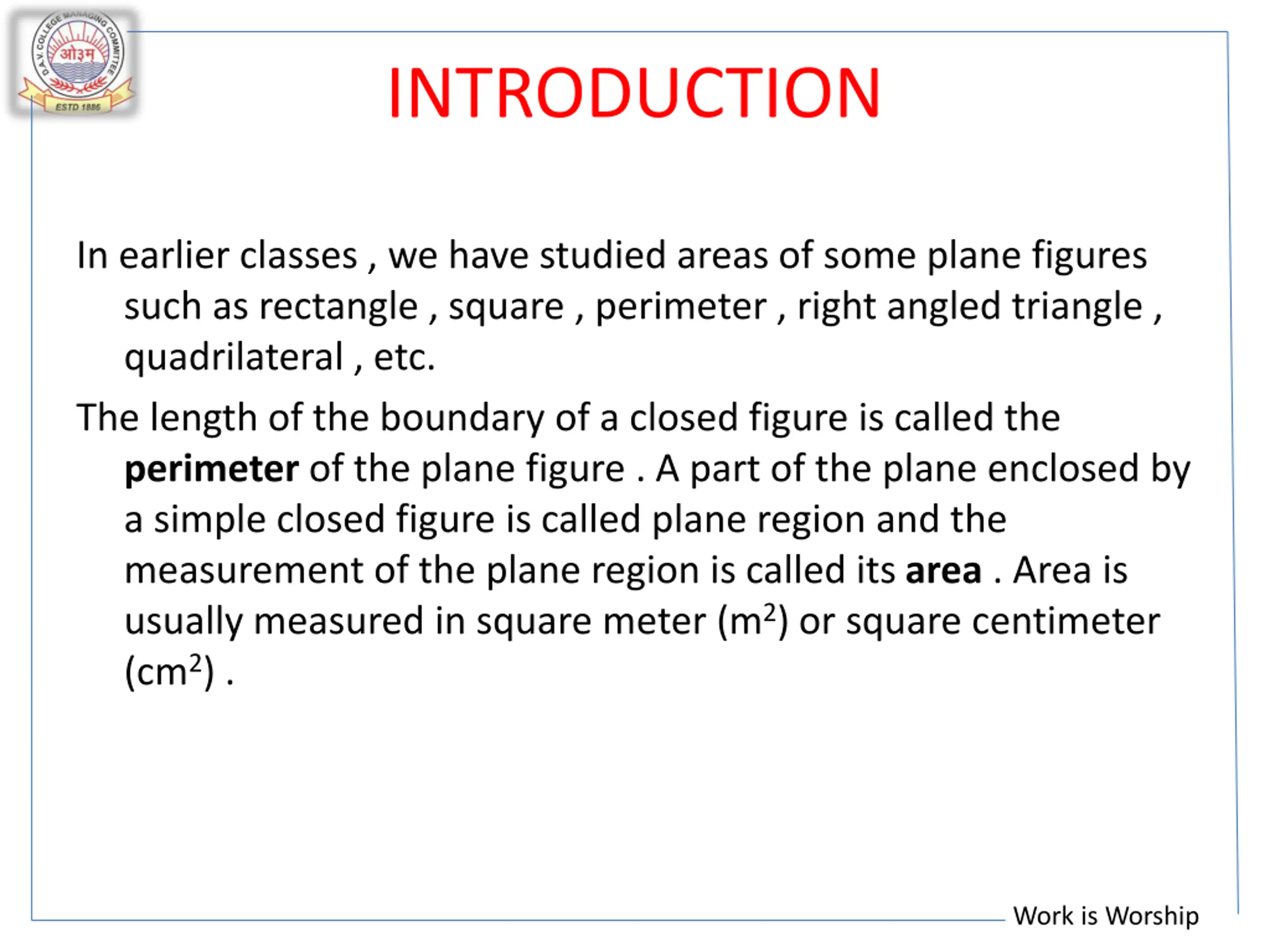 INTRODUCTION In earlier classes , we have studied areas of some plane figures such as rectangle , square , perimeter , right angled triangle , quadrilateral , etc. The length of the boundary of a closed figure is called the perimeter of the plane figure . A part of the plane enclosed by a simple closed figure is called plane region and the measurement of the plane region is called its area . Area is usually measured in square meter (m2) or square centimeter (cm2) . Work is Worship