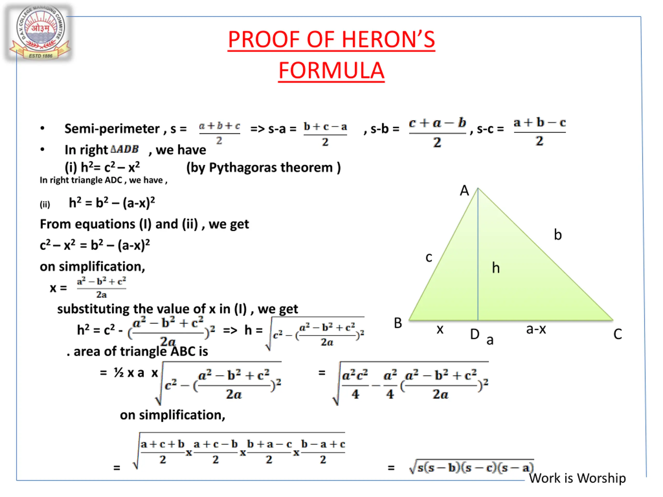 PROOF OF HERONS FORMULA Semi-perimeter , s = => s-a = , s-b = , s-c = In right , we have (i) h2= c2 x2 (by Pythagoras theorem ) In right triangle ADC , we have , A h2 = b2 (a-x)2 From equations (I) and (ii) , we get c2 x2 = b2 (a-x)2 on simplification, x = (ii) b c h substituting the value of x in (I) , we get B x a-x h2 = c2 - => h = . area of triangle ABC is = x a x = D C a on simplification, == Work is Worship