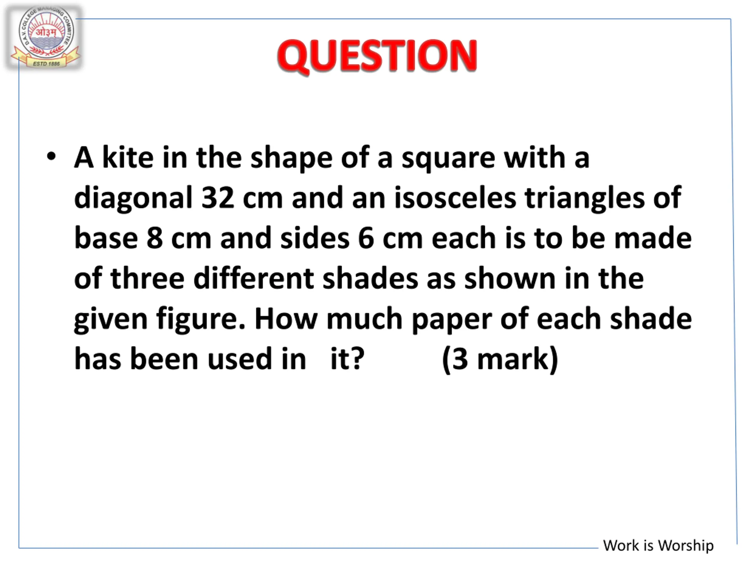 QUESTION A kite in the shape of a square with a diagonal 32 cm and an isosceles triangles of base 8 cm and sides 6 cm each is to be made of three different shades as shown in the given figure. How much paper of each shade has been used in it? (3 mark) Work is Worship