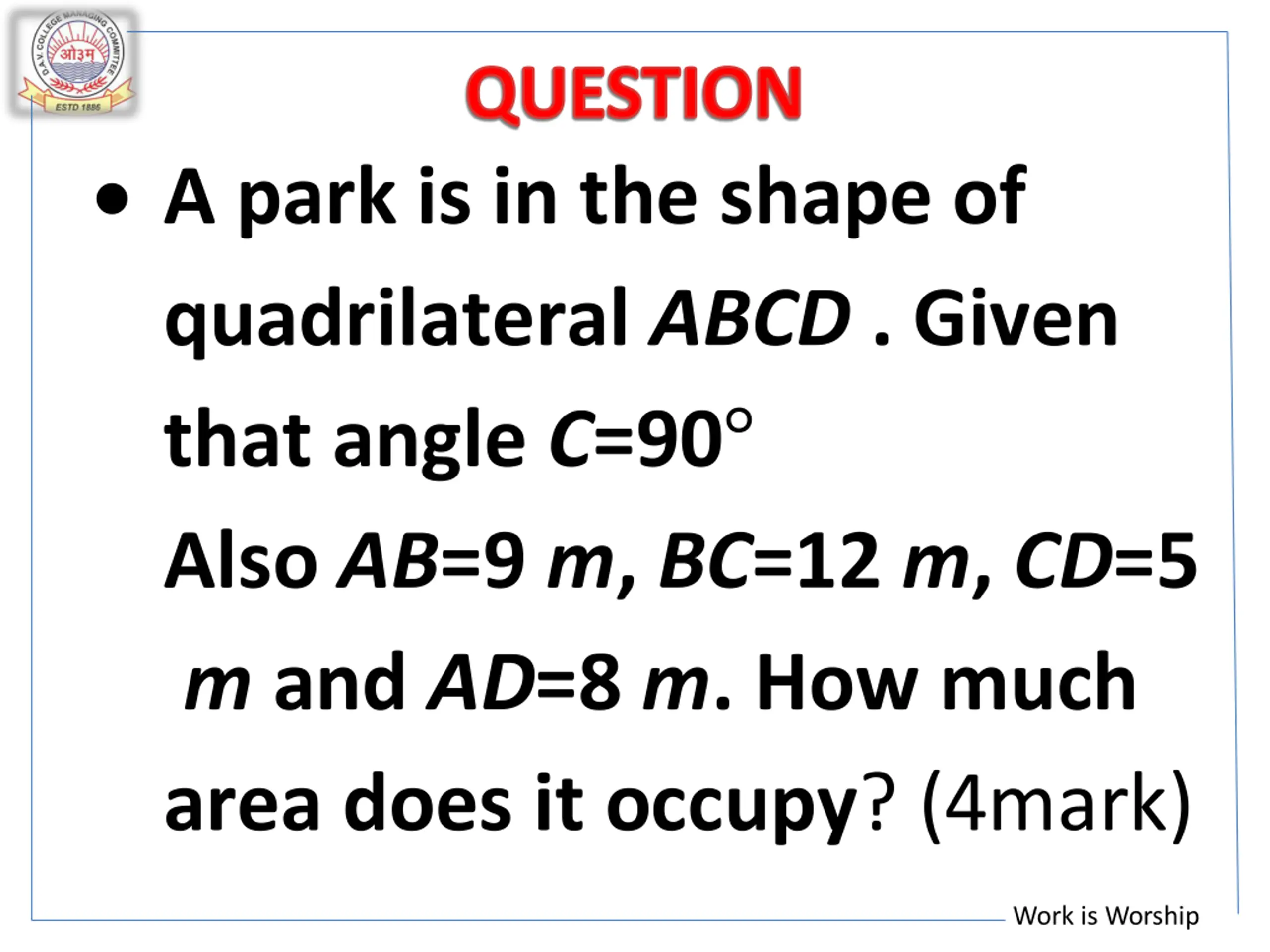 QUESTION A park is in the shape of quadrilateral ABCD . Given that angle C=90 Also AB=9 m, BC=12 m, CD=5 m and AD=8 m. How much area does it occupy? (4mark) Work is Worship