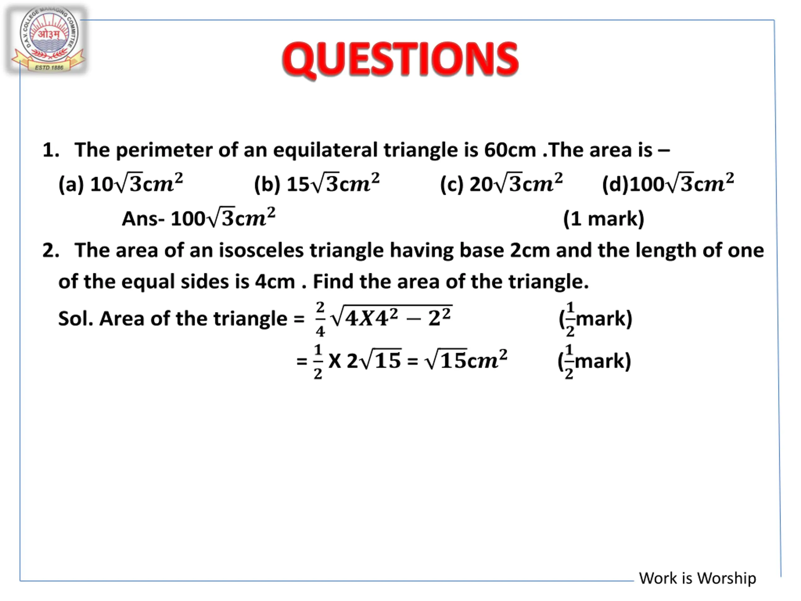 QUESTIONS 1.The perimeter of an equilateral triangle is 60cm .The area is (a) 10 ?c?? (b) 15 ?c?? (c) 20 ?c?? (d)100 ?c?? Ans- 100 ?c?? (1 mark) 2.The area of an isosceles triangle having base 2cm and the length of one of the equal sides is 4cm . Find the area of the triangle. Sol. Area of the triangle = ? ?mark) = ? ?mark) ? ???? ?? (? ? X 2 ?? = ??c?? (? Work is Worship