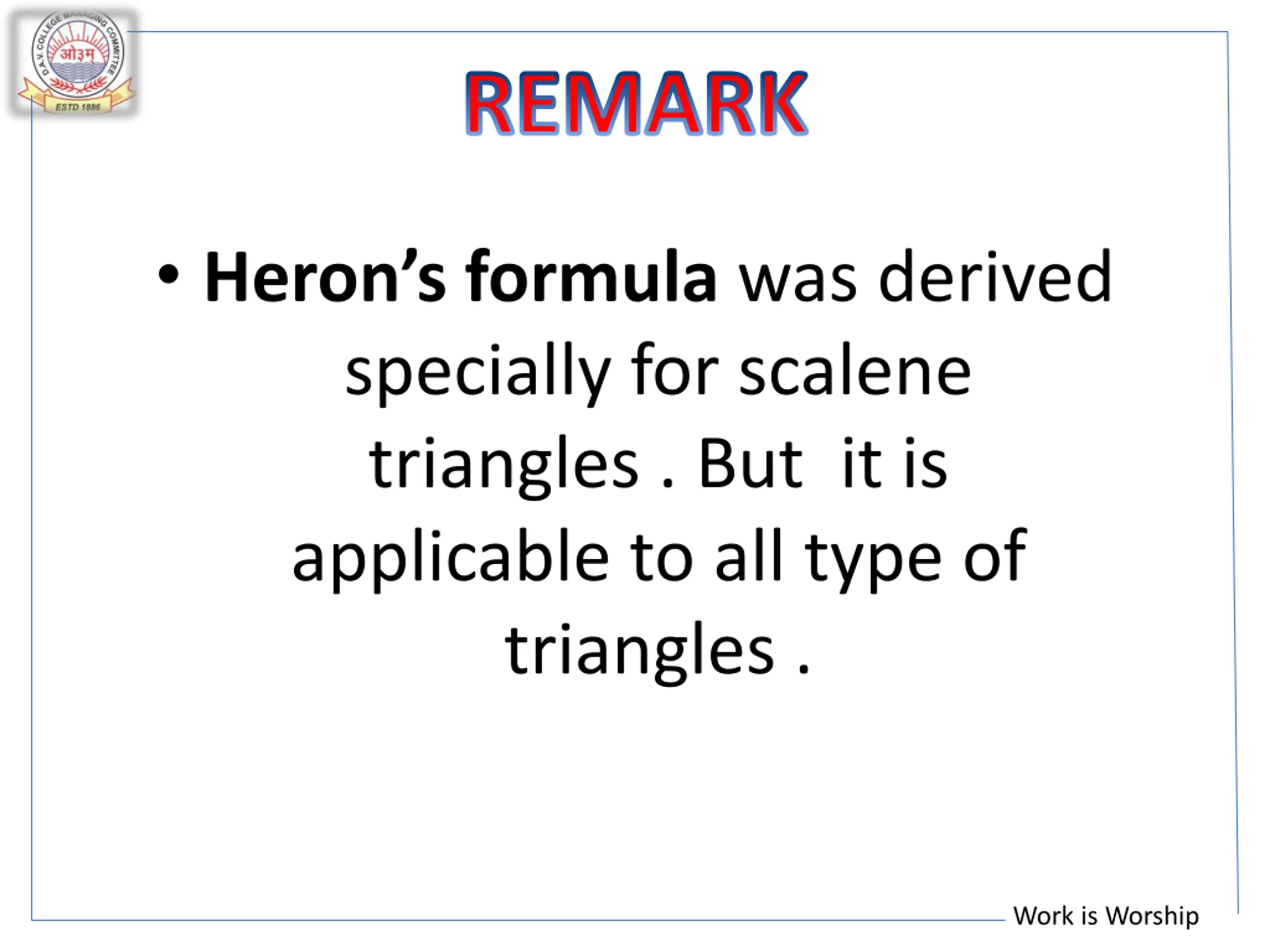 REMARK Heron sformula was derived specially for scalene triangles . But it is applicable to all type of triangles . Work is Worship
