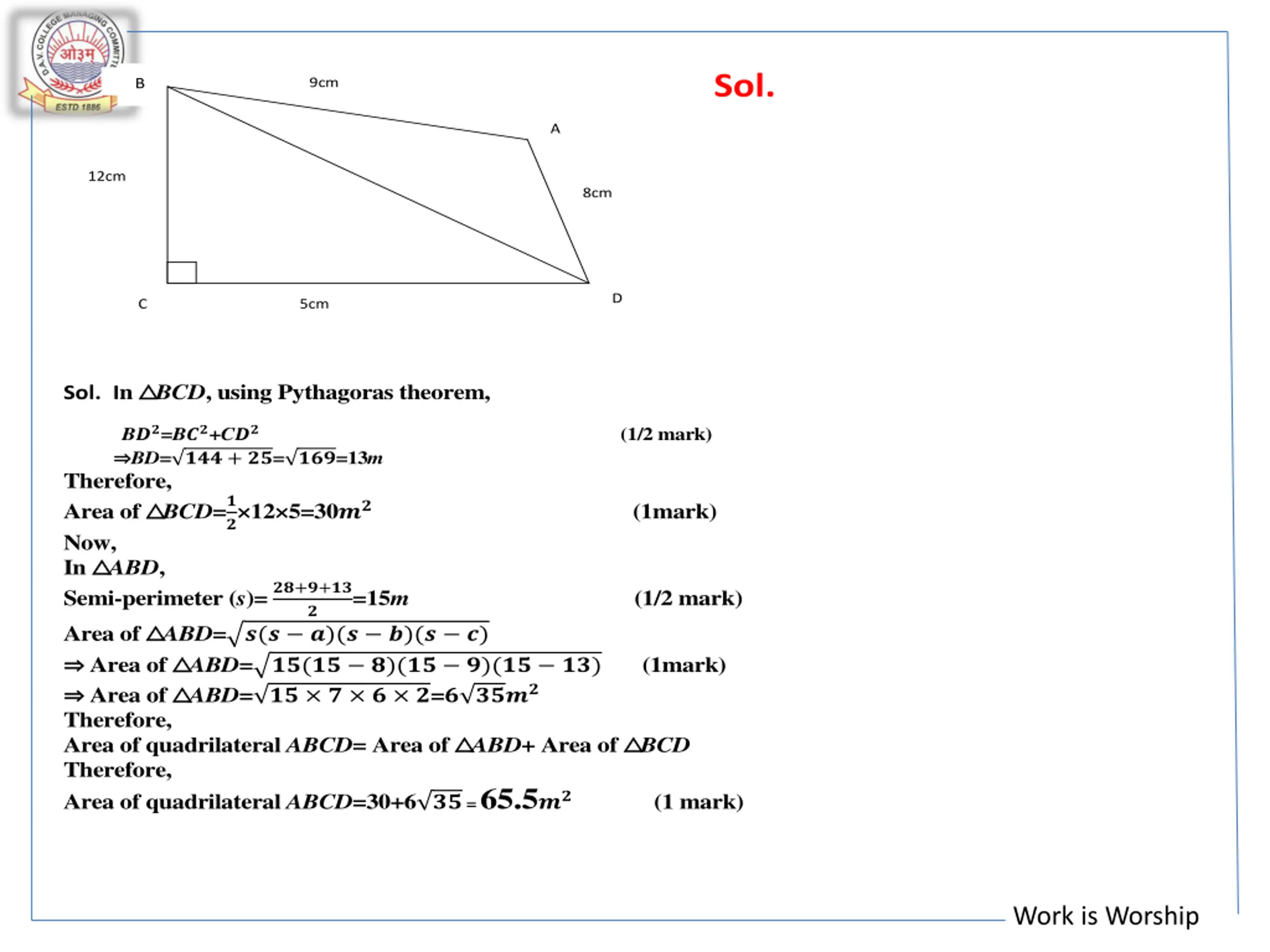 Sol. 9cm B A 12cm 8cm D C 5cm BCD, using Pythagoras theorem, Sol. In B??=B??+C??(1/2 mark) BD= ??? + ??= ???=13m Therefore, Area of BCD=? Now, In ABD, Semi-perimeter (s)=??+?+?? ? =15m (1/2 mark) Area of ABD= ?(? ?)(? ?)(? ?) Area of ABD= ??(?? ?)(?? ?)(?? ??) (1mark) Area of ABD= ?? ? ? ?=? ???? Therefore, Area of quadrilateral ABCD= Area of Therefore, Area of quadrilateral ABCD=30+6 ?? = 65.5?? (1 mark) ? 12 5=30?? (1mark) ABD+ Area of BCD Work is Worship