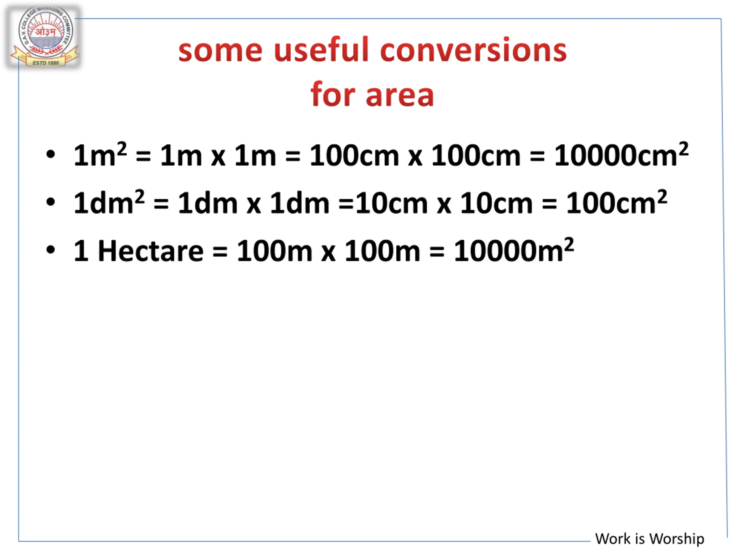 some useful conversions for area 1m2 = 1m x 1m = 100cm x 100cm = 10000cm2 1dm2 = 1dm x 1dm =10cm x 10cm = 100cm2 1 Hectare = 100m x 100m = 10000m2 Work is Worship