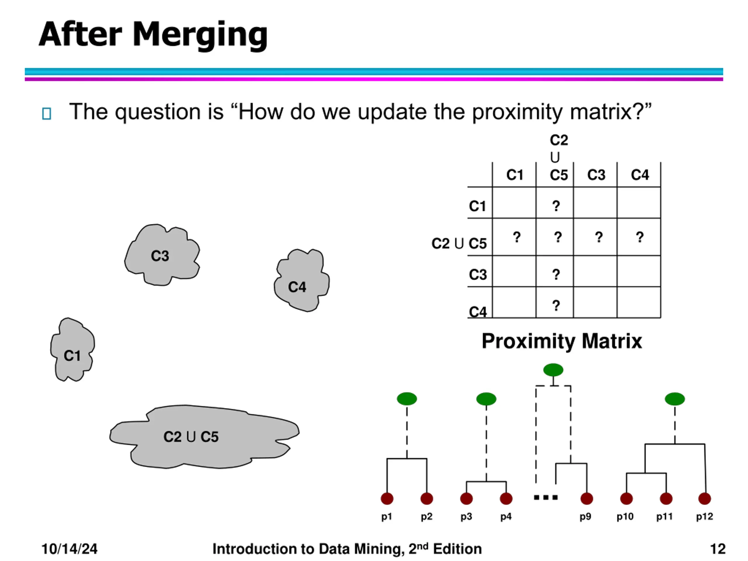 Intermediate Situation We want to merge the two closest clusters (C2 and C5) and update the proximity matrix. C1 C2 C3 C4 C5 C1 C2 C3 C3 C4 C4 C5 Proximity Matrix C1 C5 C2 ... p1 p2 p3 p4 p9 p10 p11 p12 10/14/24 Introduction to Data Mining, 2nd Edition 11