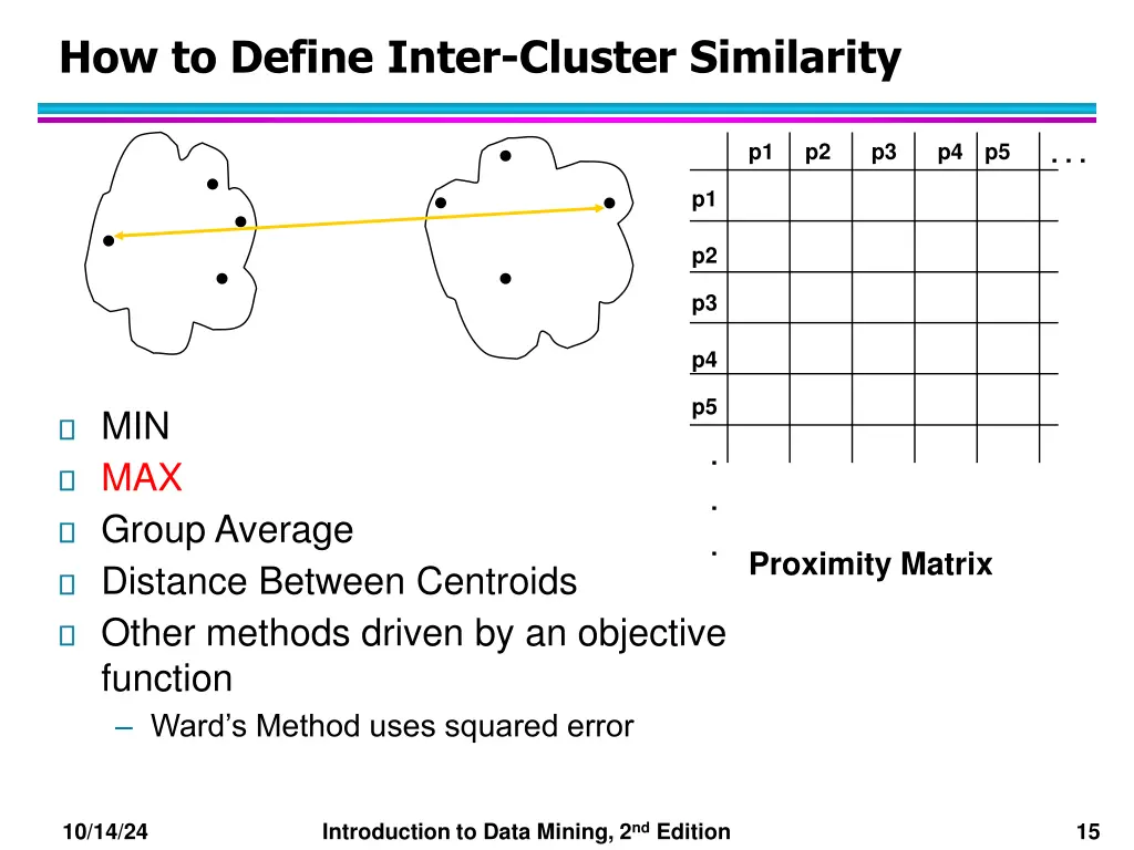 How to Define Inter-Cluster Similarity p1 p2 p3 p4 p5 . . . p1 p2 p3 p4 p5 MIN MAX Group Average Distance Between Centroids Other methods driven by an objective function Ward s Method uses squared error . . . Proximity Matrix 10/14/24 Introduction to Data Mining, 2nd Edition 14