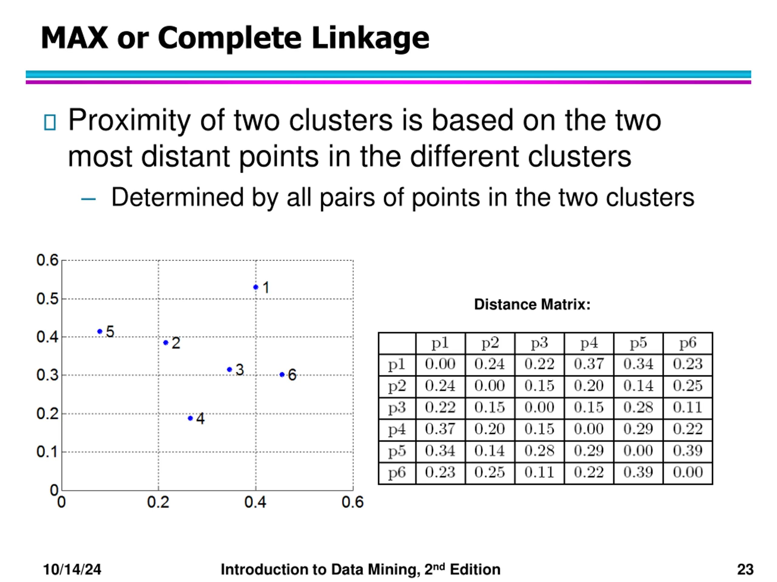 MAX or Complete Linkage Proximity of two clusters is based on the two most distant points in the different clusters Determined by all pairs of points in the two clusters Distance Matrix: 10/14/24 Introduction to Data Mining, 2nd Edition 23