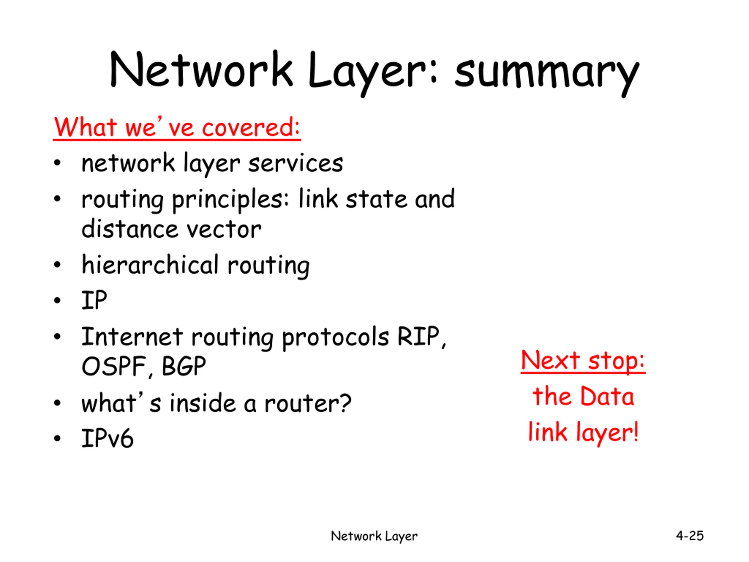 Network Layer: summary What we ve covered: network layer services routing principles: link state and distance vector hierarchical routing IP Internet routing protocols RIP, OSPF, BGP what s inside a router? IPv6 Next stop: the Data link layer! Network Layer 4-25