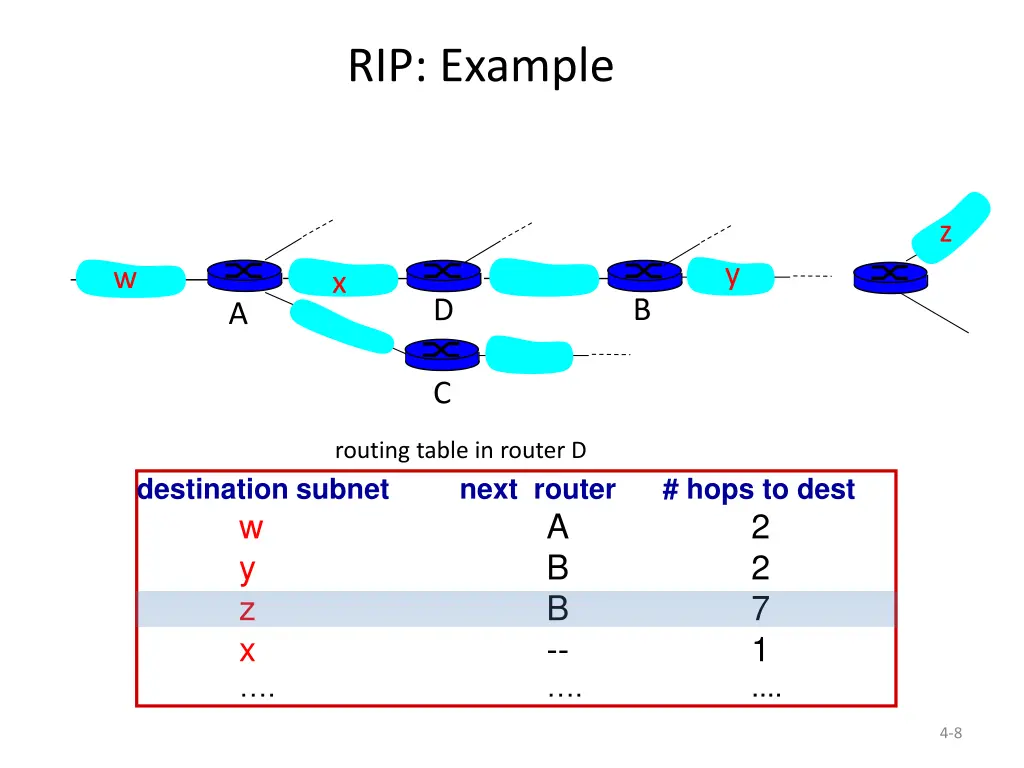 RIP: Example z y w x B D A C routing table in router D destination subnet w y z x . next router # hops to dest A B B -- . 2 2 7 1 .... 4-8