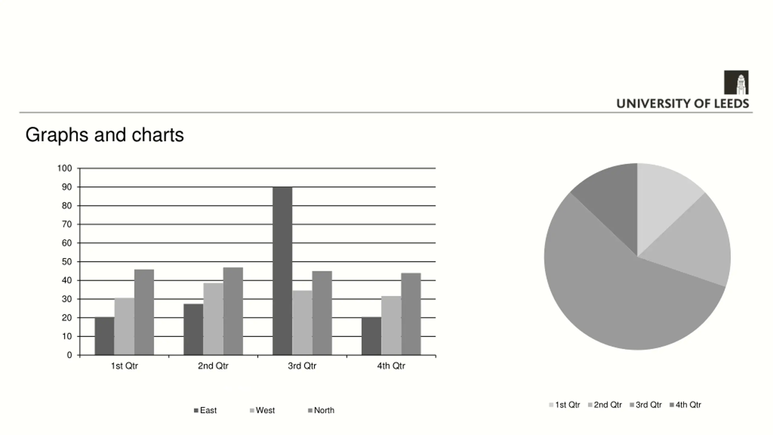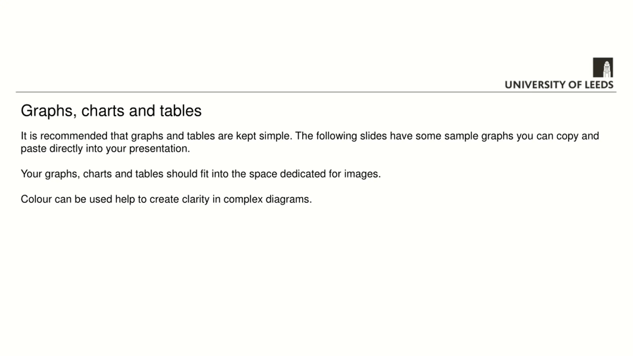 Graphs, charts and tables It is recommended that graphs and tables are kept simple. The following slides have some sample graphs you can copy and paste directly into your presentation. Your graphs, charts and tables should fit into the space dedicated for images. Colour can be used help to create clarity in complex diagrams.