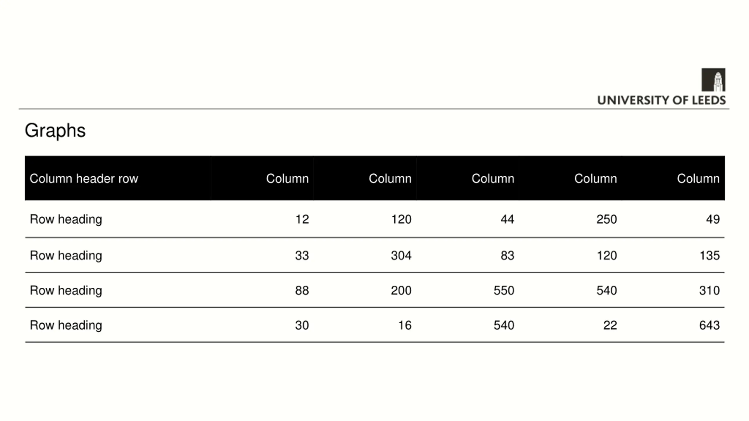 Graphs Column header row Column Column Column Column Column Row heading 12 120 44 250 49 Row heading 33 304 83 120 135 Row heading 88 200 550 540 310 Row heading 30 16 540 22 643