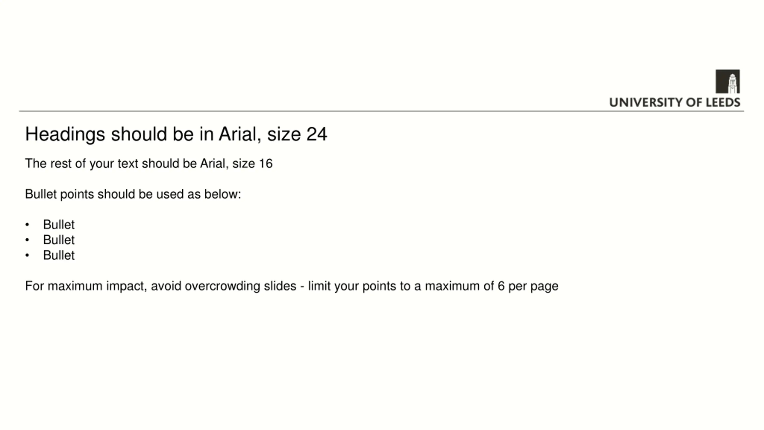 Headings should be in Arial, size 24 The rest of your text should be Arial, size 16 Bullet points should be used as below: Bullet Bullet Bullet For maximum impact, avoid overcrowding slides - limit your points to a maximum of 6 per page