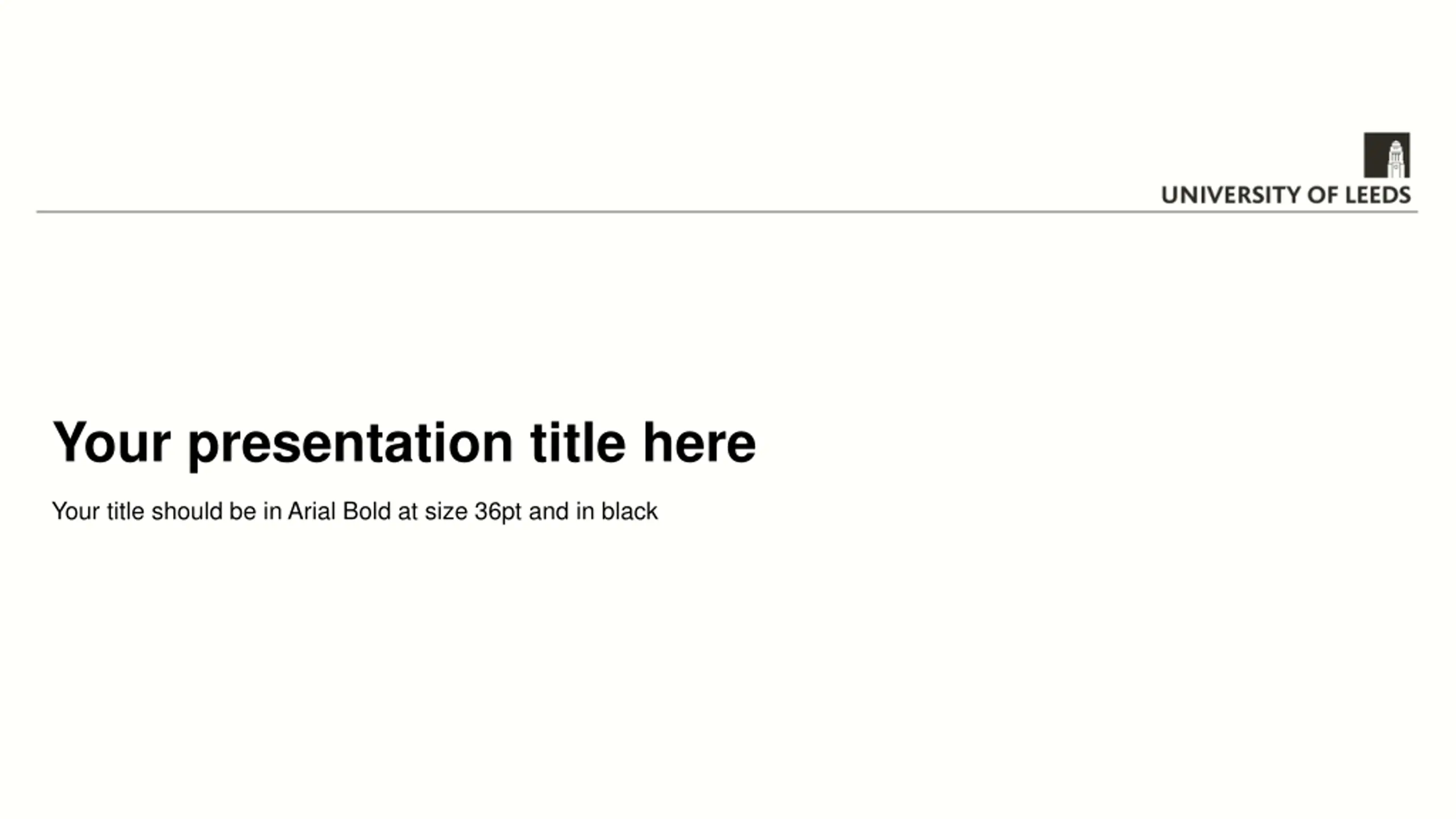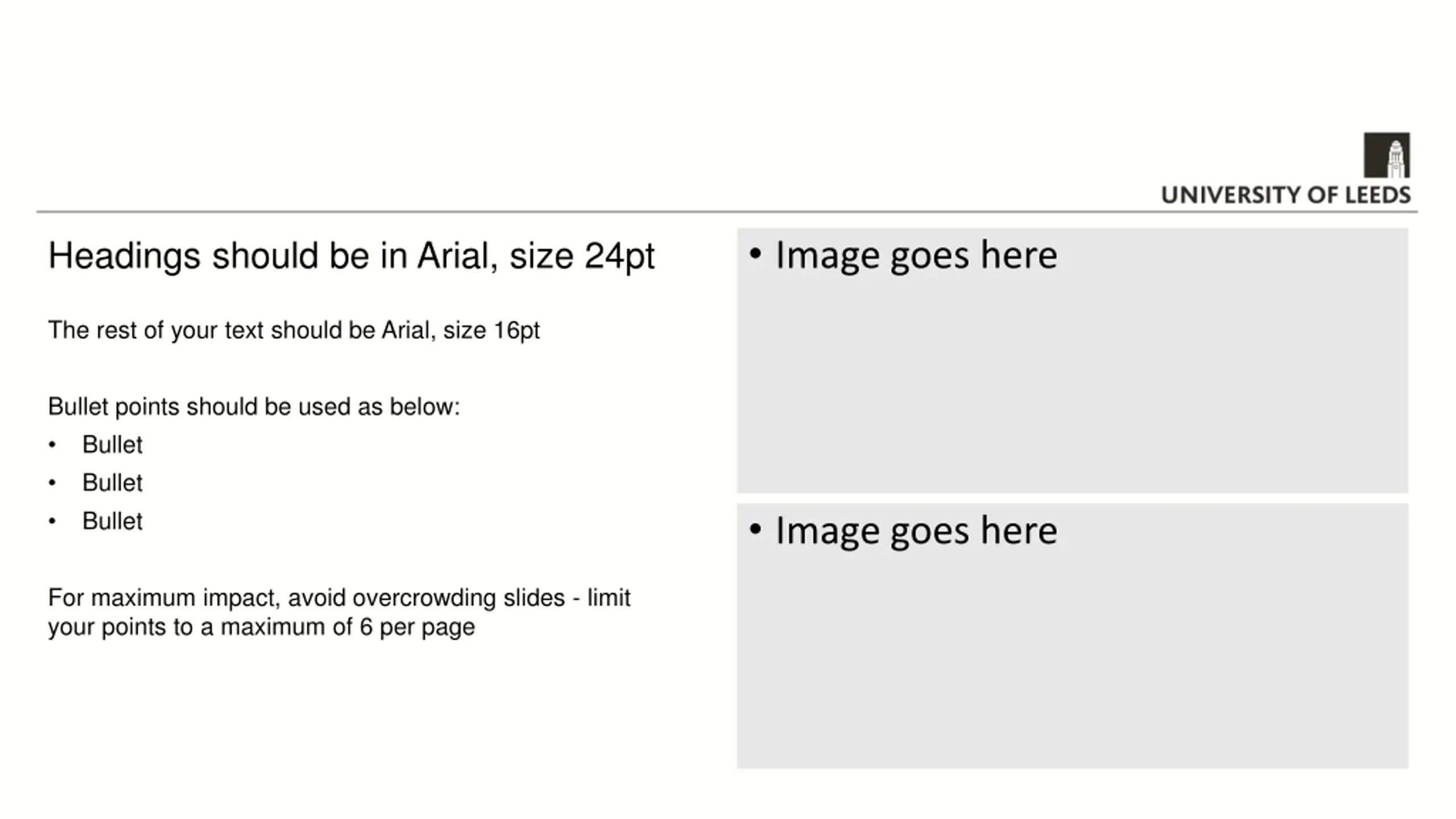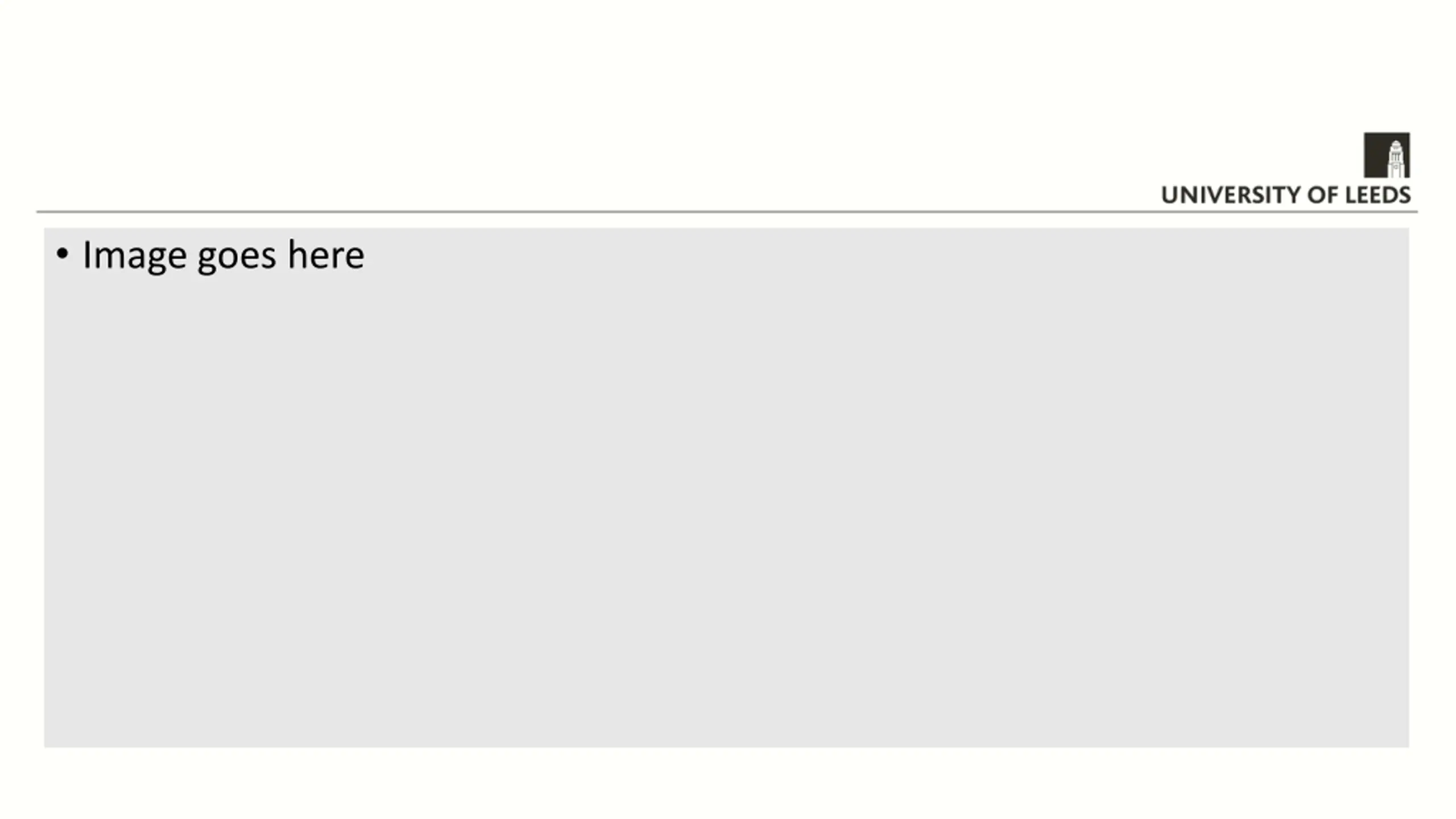 Image suggestions You can request downloads from the University image library at https://imagelibrary.leeds.ac.uk/asset-bank/action/viewHome If you are using your own images, please try to avoid low quality files as this will effect the quality of the presentation.
