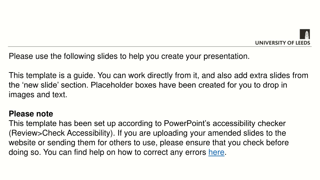 Please use the following slides to help you create your presentation. This template is a guide. You can work directly from it, and also add extra slides from the new slide section. Placeholder boxes have been created for you to drop in images and text. Please note This template has been set up according to PowerPoint s accessibility checker (Review>Check Accessibility). If you are uploading your amended slides to the website or sending them for others to use, please ensure that you check before doing so. You can find help on how to correct any errors here.