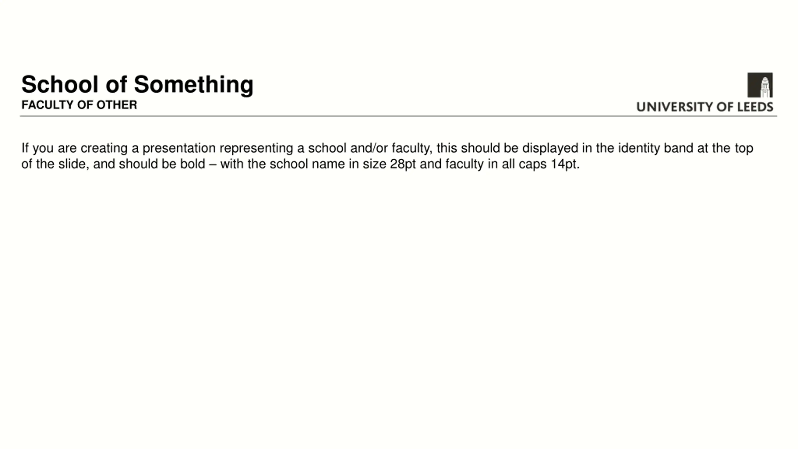 School of Something FACULTY OF OTHER If you are creating a presentation representing a school and/or faculty, this should be displayed in the identity band at the top of the slide, and should be bold with the school name in size 28pt and faculty in all caps 14pt.